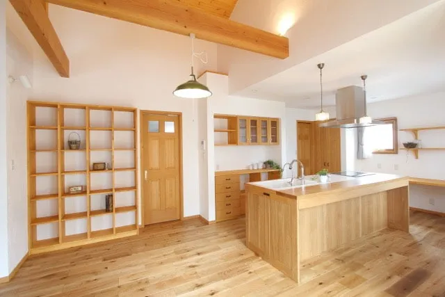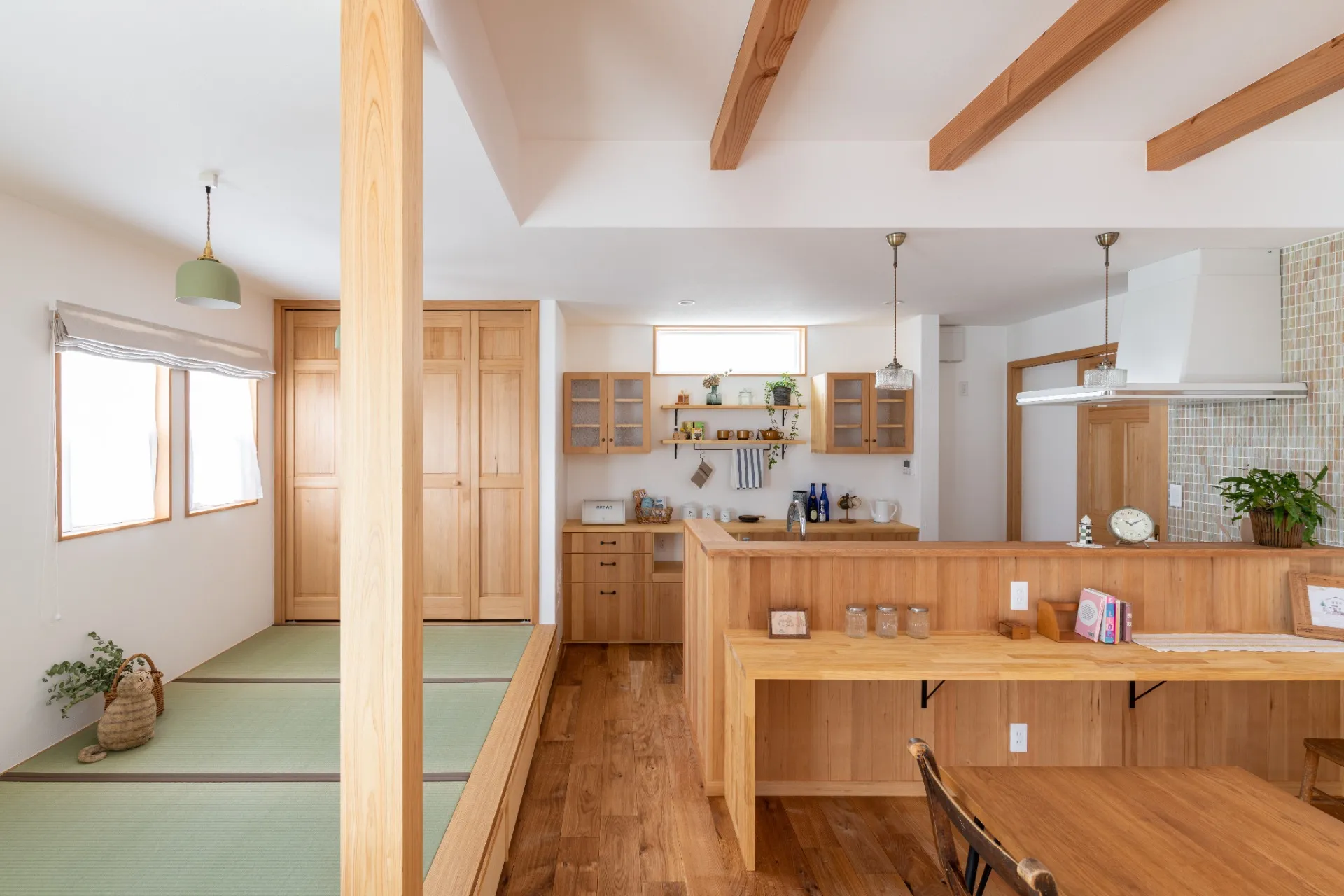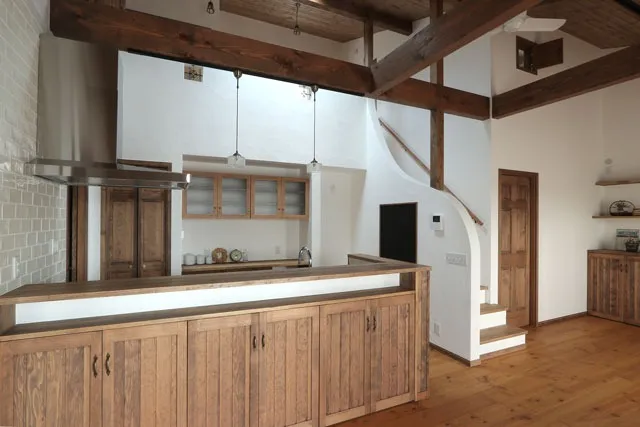 家が建った後、「家具を置いたら狭くなってしまった」ということがないように、設計段階で家具の配置まで計画しています。その際にオススメしているのが、造り付けの家具。後から間取りにピッタリと合う家具を見つけるのは、思った以上に大変なことですが、造作家具なら、最初から図面上に落とし込んで設計ができ、ガラスやアイアン、塗装など、好きなデザインを取り入れることも可能です。統一感のあるインテリアになるのはもちろん、地震などによって倒れる心配もありません。システムキッチンの周りを造作で仕上げるキッチンコーナーも好評です。