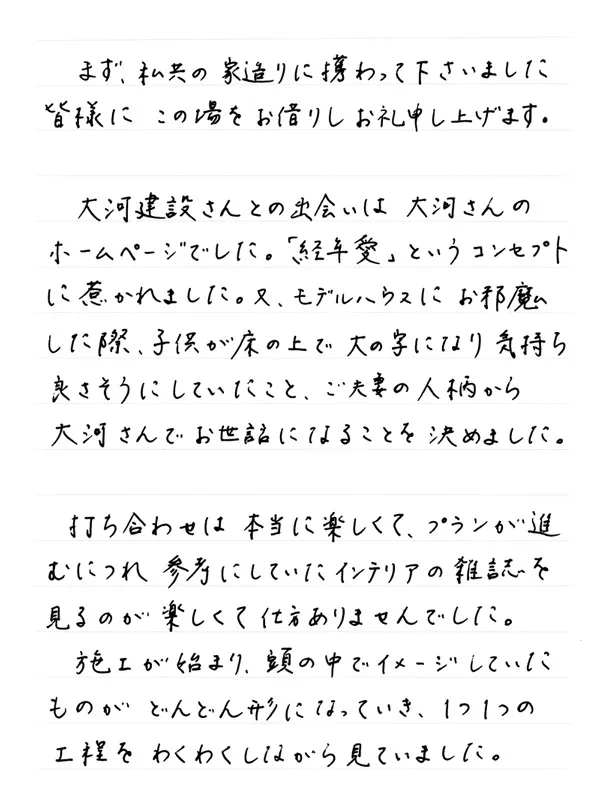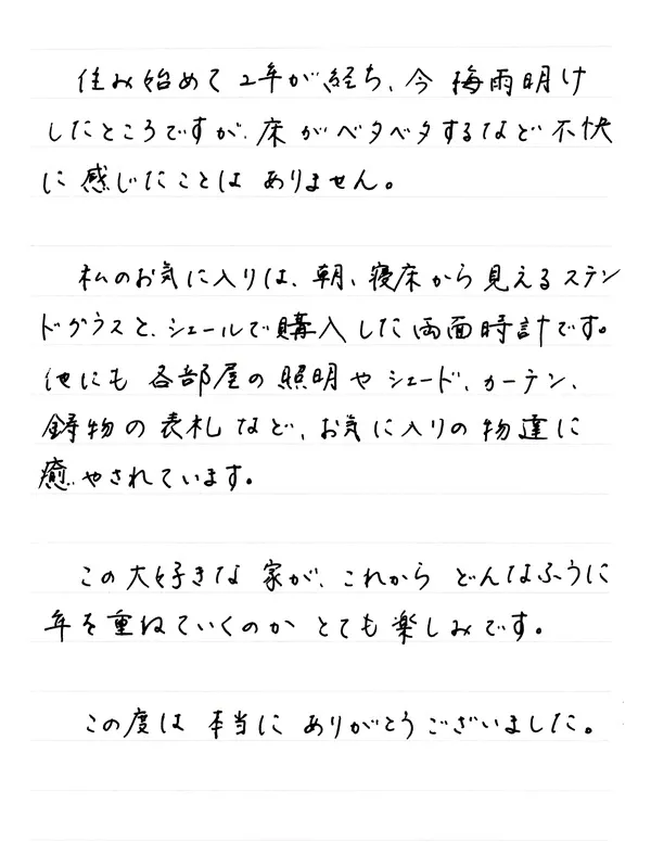 お気に入りのインテリアやお庭に囲まれて、楽しく生活を送っていらっしゃるようですね。家が完成した後もショールーム2階の雑貨ショップ「シェール」で家具や雑貨をご購入いただき、ありがとうございます。私たちも、どんどん素敵になっていくC様邸を見るのがとても楽しみです。またいつでもショップに遊びにいらしてください。本当にありがとうございました。