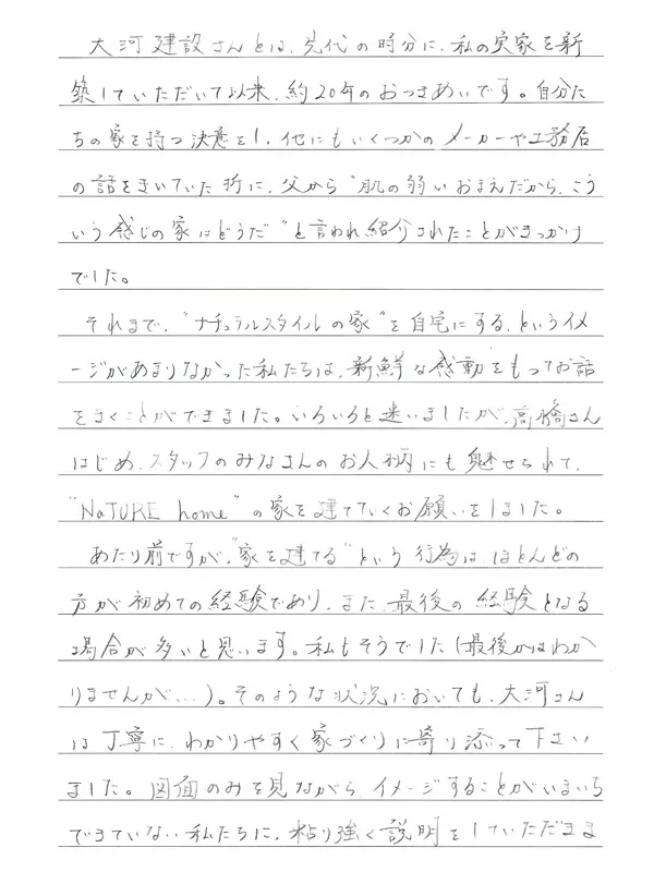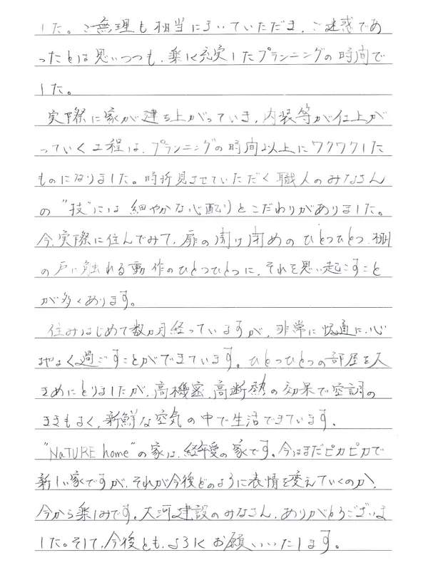 住みはじめて数ヶ月経っていますが、非常に快適に心地よく過ごすことができています。ひとつひとつの部屋を大きめにとりましたが、高気密・高断熱の効果で空調のききもよく、新鮮な空気の中で生活できています。「NaTURE home」の家は、経年愛の家です。今はまだピカピカで新しい家ですが、それが今後どのように表情を変えていくのか、今から楽しみです。大河建設の皆さん、ありがとうございました。そして、今後ともよろしくお願いいたします。