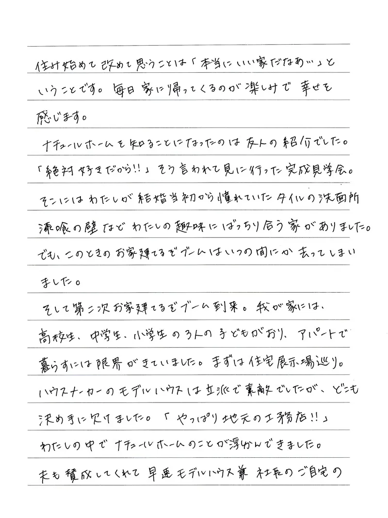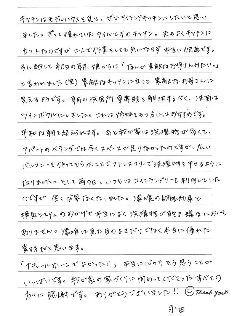とても嬉しいお言葉をいただきましてありがとうございます。お声を読まさせていただき、今回家を建てさせていただくことになるまでにこのような物語があったことを知り、とても感慨深い気持ちになりました。ご家族それぞれの家への想いが、文面からじんわりと伝わってきました。