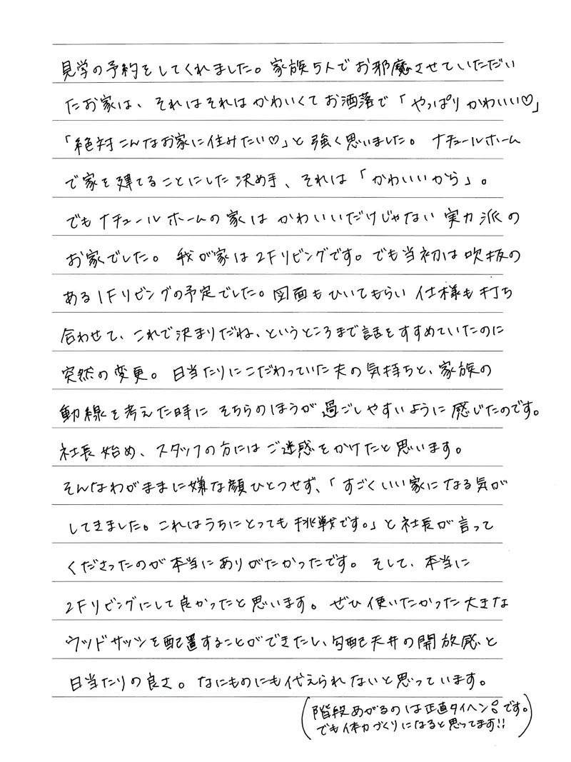 「ナチュールホームでよかった!!」本当に心からそう思うことがいっぱいです。我が家の家づくりに関わってくださったすべての方々に感謝です。ありがとうございました!!