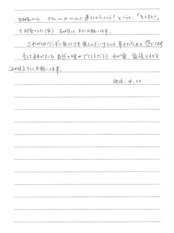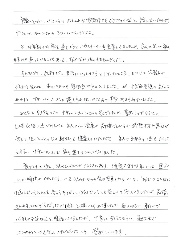 3、4年前から家を建てようとハウスメーカーを見学してましたが、主人と私の家の好みが違っていることもあって、なかなか決まりませんでした。そんな折、近所だし見学にいってみようと行ったところ、もともと木製品が好きな私は、木のにおいや雰囲気が気に入りました。が、性能重視の主人にかかるとナチュールさんでは建てられないかなぁと半分あきらめていました。