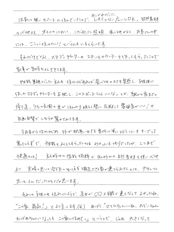 3月末から住みはじめ、外が肌寒い日でも室内は常に20℃くらいをキープして寒さしらずで、性能をよくしてもらったのはわかっているつもりでしたが、ここまで快適とは!主人好みの性能抜群で私好みの自然素材を使い心地よい、夫婦の思いの合作といえる満足できる家が建てられたのはナチュールホームさんだったからだと思います。
