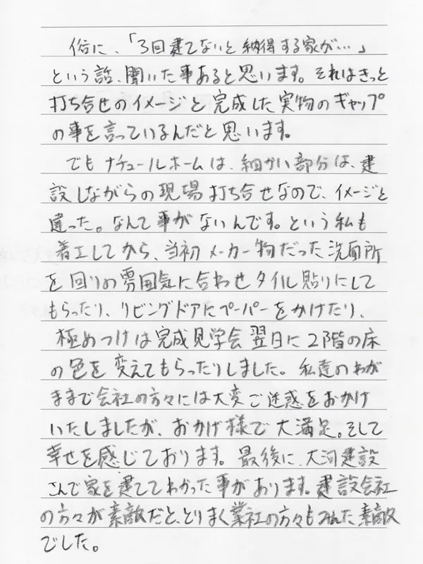 俗に、「3回建てないと納得する家が…」という話、聞いたことあると思います。それはきっと打ち合せのイメージと完成した実物のギャップのことを言っているんだと思います。でもナチュールホームは、細かい部分は、建設しながらの現場打ち合せなので、イメージと違った。なんてことがないんです。