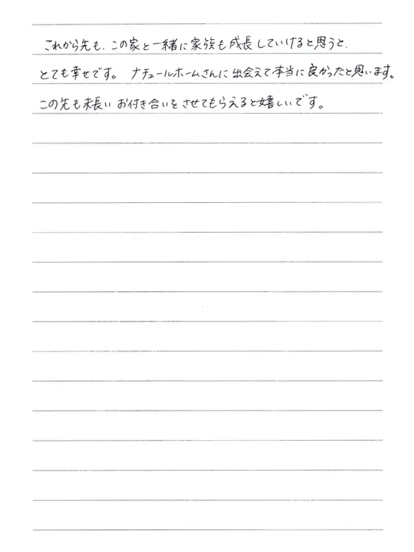 これから先も、この家と一緒に家族も成長していけると思うと、とても幸せです。ナチュールホームさんに出会えて本当に良かったと思います。この先も末長いお付き合いをさせてもらえると嬉しいです。