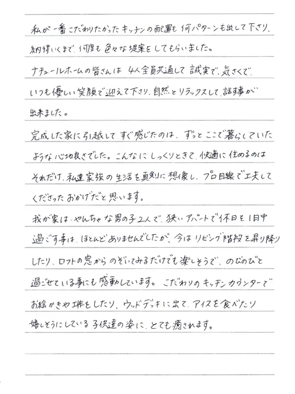 その後、プランニングをしていく中で事細かに話を聞いて下さり、初めて出してもらったプランを見た時は、私達の希望が全部無駄なく収められていて設計の素晴らしさに驚きました。私が一番こだわりたかったキッチンの配置も何パターンも出して下さり、納得いくまで何度も色々な提案をしてもらいました。ナチュールホームの皆さんは4人全員共通して誠実で、気さくで、いつも優しい笑顔で迎えて下さり、自然とリラックスして話す事が出来ました。