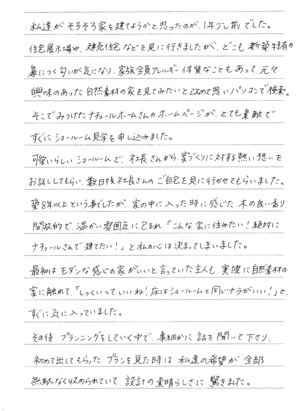 かわいらしいショールームで、社長さんから家づくりに対する熱い想いをお話してもらい、数日後社長さんのご自宅を見に行かせてもらいました。築8年以上という事でしたが、家の中に入った時に感じた木の良い香り、開放的で暖かい雰囲気に包まれ、「こんな家に住みたい!絶対にナチュールさんで建てたい!」と私の心は決まってしまいました。最初はモダンな感じの家がいいと言っていた主人も、実際に自然素材の家に触れて「しっくいっていいね!床はショールームと同じナラがいい!」とすぐに気に入っていました。