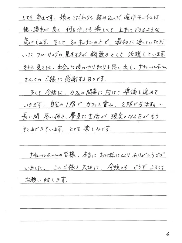 そして今後は、カフェの開業に向けて準備を進めていきます。自宅の1階でカフェを営み、2階で生活する…長い間思い描き、夢見た生活が現実となる日がもうそこまできています。とても楽しみです。ナチュールホームの皆様、本当にお世話になりありがとうございました。このご縁を大切に、今後ともどうぞよろしくお願い致します。
