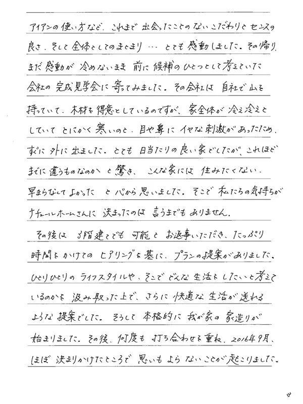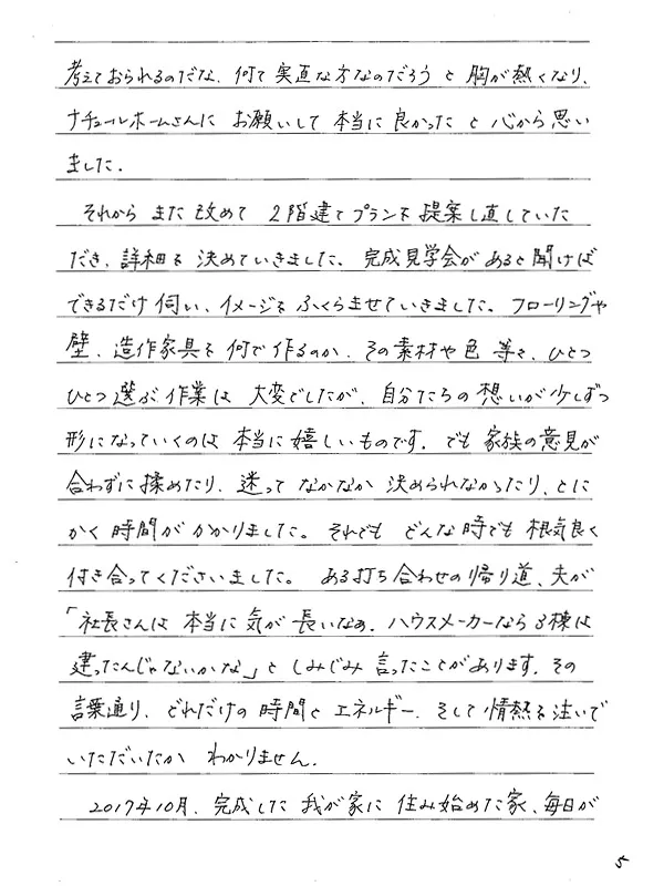 Tさま、この度は心のこもったお声をありがとうございました。まるで短編小説のような文章にスタッフ一同釘付けになり、感動をいただきました!特に弊社を選んでいただくまでの経緯は、これから家づくりをされる方にぜひ読んでいただきたい部分です。