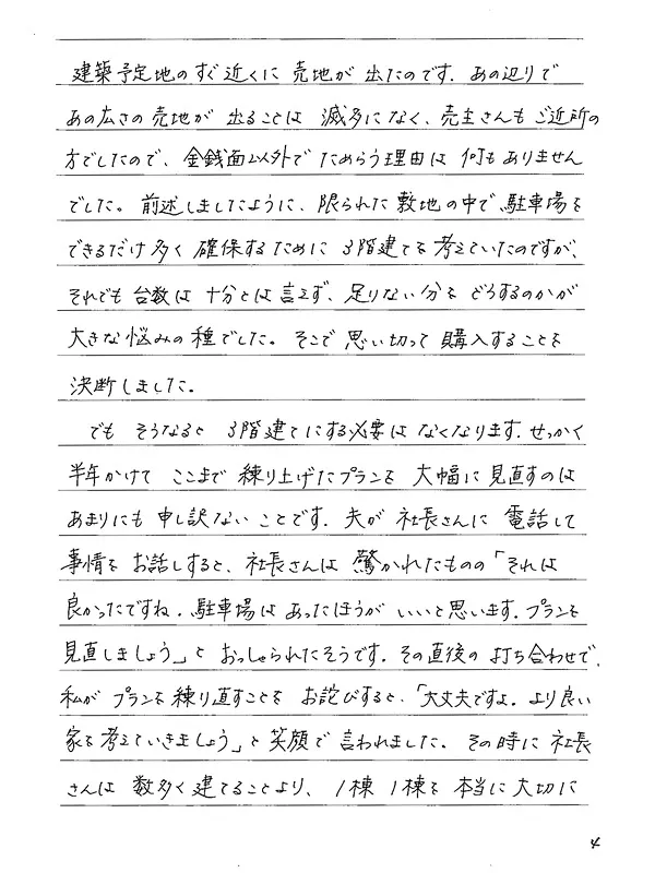 建築予定地のすぐ近くに売地が出たのです。あの辺りであの広さ売地が出ることは滅多になく、売主さんもご近所の方でしたので、金銭面以外でためらう理由は何もありませんでした。前述しましたように、限られた敷地の中で、駐車場をできるだけ多く確保するために3階建てを考えていたのですが、それでも台数は十分とは言えず、足りない分をどうするのかが大きな悩みの種でした。そこで思い切って購入することを決断しました。