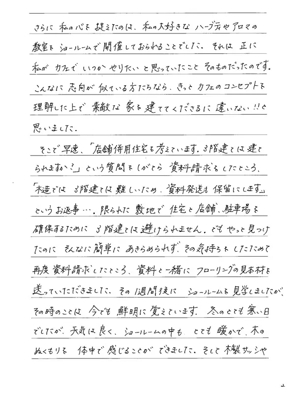 そこで早速、「店舗併用住宅を考えています。3階建ては建てられますか?」という質問をしがてら資料請求したところ、「木造では3階建ては難しいため、資料発送を保留にします。」というお返事…。限られた敷地で住宅を店舗、駐車場を確保するために3階建ては避けられません。でもやっと見つけたのにそんなに簡単にあきらめられず、その気持ちをしたためて再度資料請求したところ、資料と一緒にフローリングの見本材を送っていただきました。