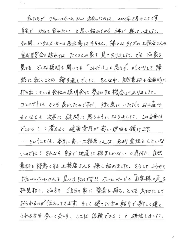 私たちがナチュールホームさんと出会ったのは、2016年2月のことです。自宅でカフェを営みたいと思い始めてから3年が経っていました。その間、ハウスメーカーの展示場はもちろん、様々なタイプの工務店さんの完成見学会に訪れてはたくさんお家を見て回りました。でもどの家を見ても、どんな説明を聞いても「これだ!!」と思えず、がっかりして帰路に就くことの繰り返しでした。