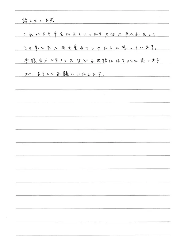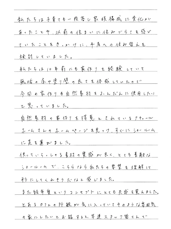 沢山の要望を叶えて下さり、また理想の家を形にして下さったナチュールホームの皆様には感謝の気持ちでいっぱいです。主人ともいつもナチュールホームさんにお願いして良かったねと話しています。これからも手を加えていったり大切に手入れをして、この家と共に年を重ねていけたらと思っています。今後もメンテナンスなどお世話になるかと思いますが、よろしくお願いいたします。