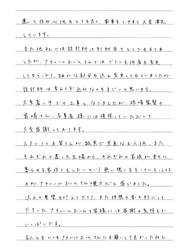 大変暑い中での工事となりましたが、現場監督の宮嶋さん、各業者様には頑張っていただいて大変感謝しております。スタッフの方皆さんが誠実で実直なお人柄、またそれぞれの違った立場から、それぞれの家族が幸せに暮らせる家作りをしたいという熱い想いをもっていらっしゃるのが、ナチュールホームさんの魅力だと感じました。