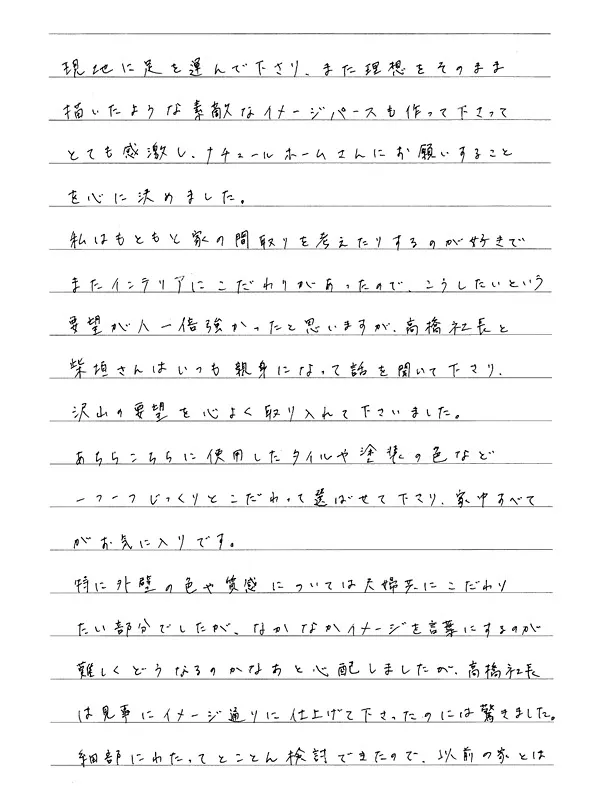 特に外壁の色や質感については夫婦共にこだわりたい部分でしたが、なかなかイメージを言葉にするのが難しくどうなるのかなあと心配しましたが、高橋社長は見事にイメージ通りに仕上げて下さったのには驚きました。細部にわたってとことん検討できたので、以前の家とは違って住み心地もとても良く、家事もしやすく大変満足しています。また他社では設計料は別料金のところもありましたが、ナチュールホームさんではプランを何度も変更してもらったり、細かな部分も沢山変更してもらいましたが設計料は変わらず込みなのもすごいと思います。