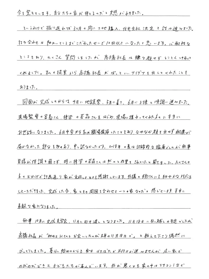 無事10月に完成見学会、11月に引き渡しとなりました。11月18日に引っ越しの予定でしたが、高橋社長が「初めてHさんとお会いしたのが11月18日で」と教えて下さり偶然にびっくりしました。暮らし始めてからも毎日ばたばたで片付けが進みませんが、広い家でのびのびできて子どもたちが喜んでいます。