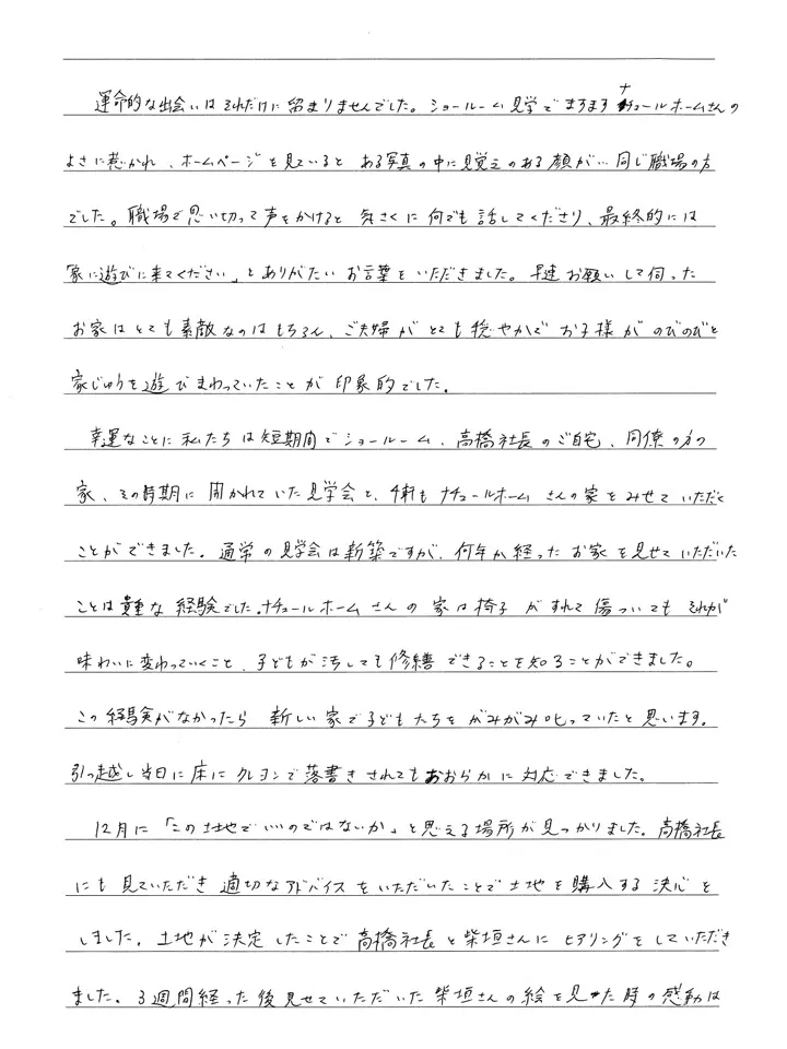 運命的な出会いはそれだけに留まりませんでした。ショールーム見学でますますナチュールホームさんのよさに惹かれ、ホームページを見ているとある写真の中に見覚えのある顔が…同じ職場の方でした。職場で思い切って声をかけると気さくに何でも話してくださり、最終的には「家に遊びに来てください」とありがたいお言葉をいただきました。早速お願いして伺ったお家はとても素敵なのはもちろん、ご夫婦がとても穏やかでお子様がのびのびと家じゅうを遊びまわっていたことが印象的でした。