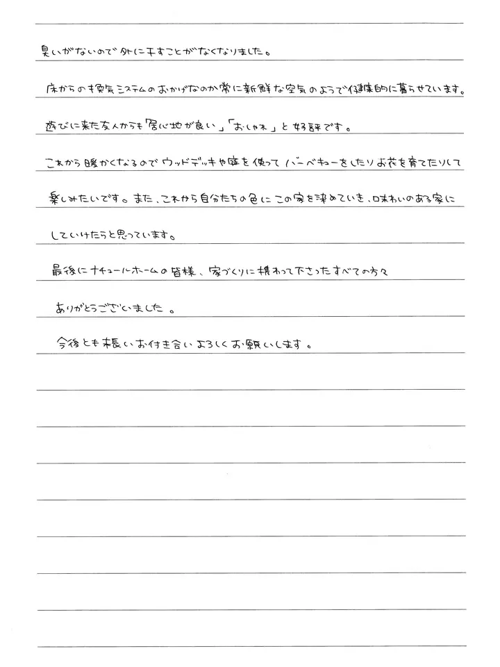最期にナチュールホームの皆様、家づくりに携わって下さったすべての方々ありがとうございました。今後とも末長くお付き合いよろしくお願いします。