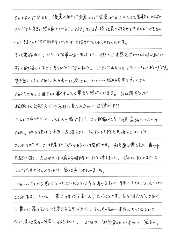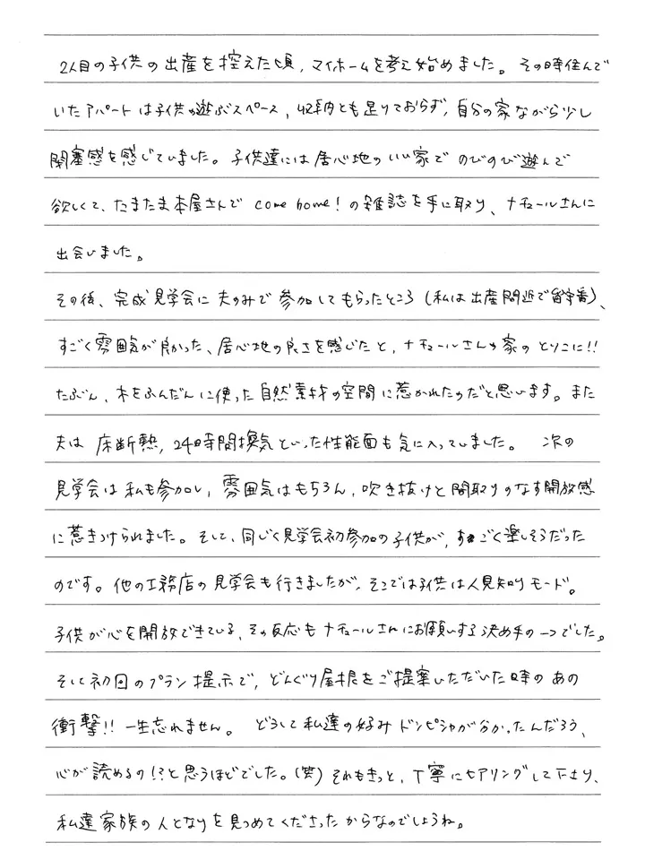 この家は私達にとって最高の家です。今思うのは、ほかのお家も見学会でいくつか見させていただきましたが、どのお家もそれぞれのご家族にとって最高な家なんだろうなということです。ご家族の思いをくみ取り形にされる、人思いのナチュールさんに出会えて本当に良かったです。
