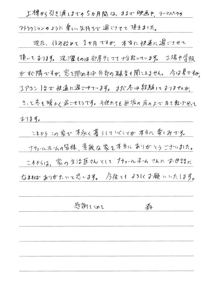 現在、住み始めて1ヶ月ですが、本当に快適に過ごさせて頂いております。洗濯ものは部屋干しで十分乾いています。工場や学校がすぐ隣ですが、窓を閉めれば外部の騒音も聞こえません。今は夏ですが、エアコン1台で快適に過ごせています。まだ冬は経験しておりませんが、きっと冬も暖かく過ごせそうです。子供たちも無垢の床の上で日々転げ回っております。