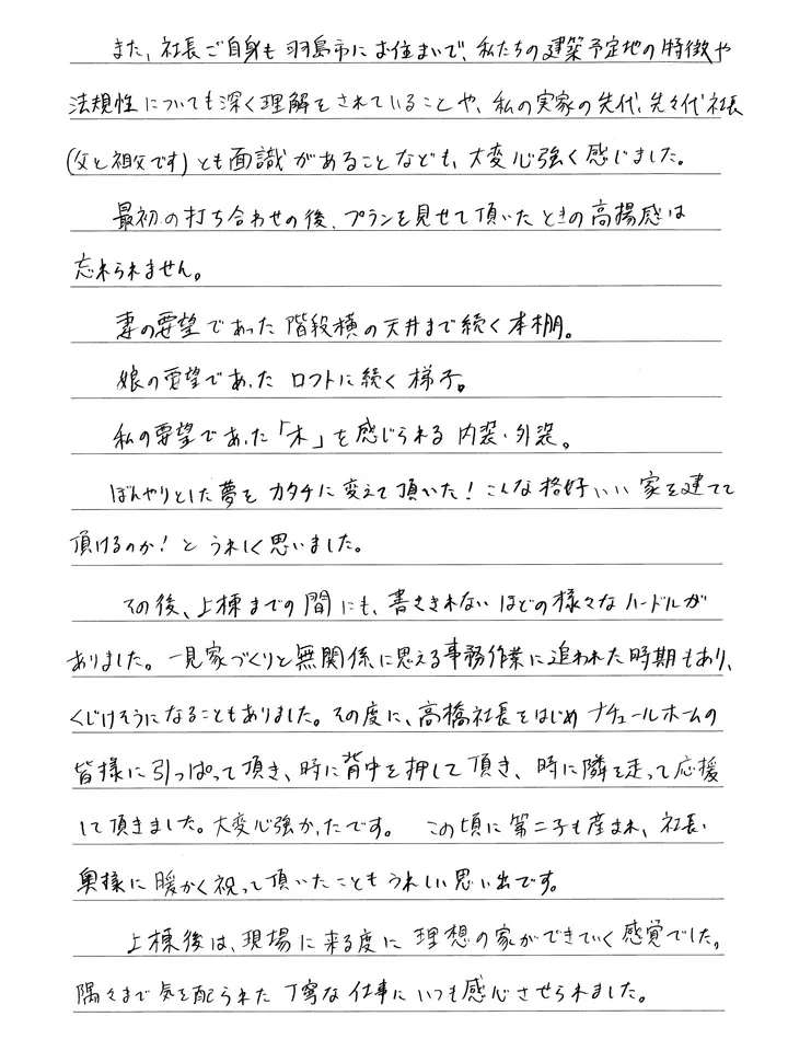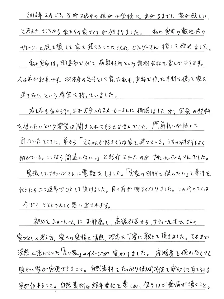 初めてショールームへお邪魔し、高橋社長からナチュールホームさんの家づくりの考え方、家への愛情と情熱、理念を丁寧に教えて頂きました。それまで漠然と抱いていた「良い家」のイメージが変わりました。床暖房を使わなくても暖かい家が実現できること。自然素材をたっぷり使えば、子供を安心して育てられる家が作れること。自然素材は経年変化を楽しめ、使うほど愛情が湧くこと。また、社長ご自身も羽島市にお住まいで、私たち建築予定地の特徴や法規性についても深く理解をされていることや、私の実家の先代、先々代社長(父と祖父です)とも面識があることなども大変心強く感じました。
