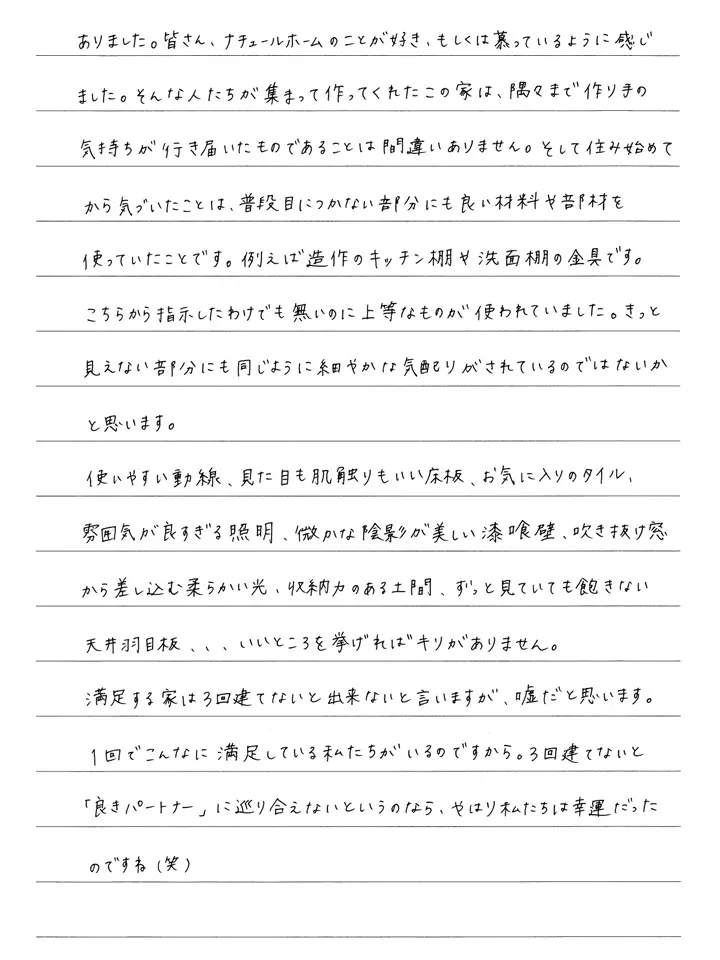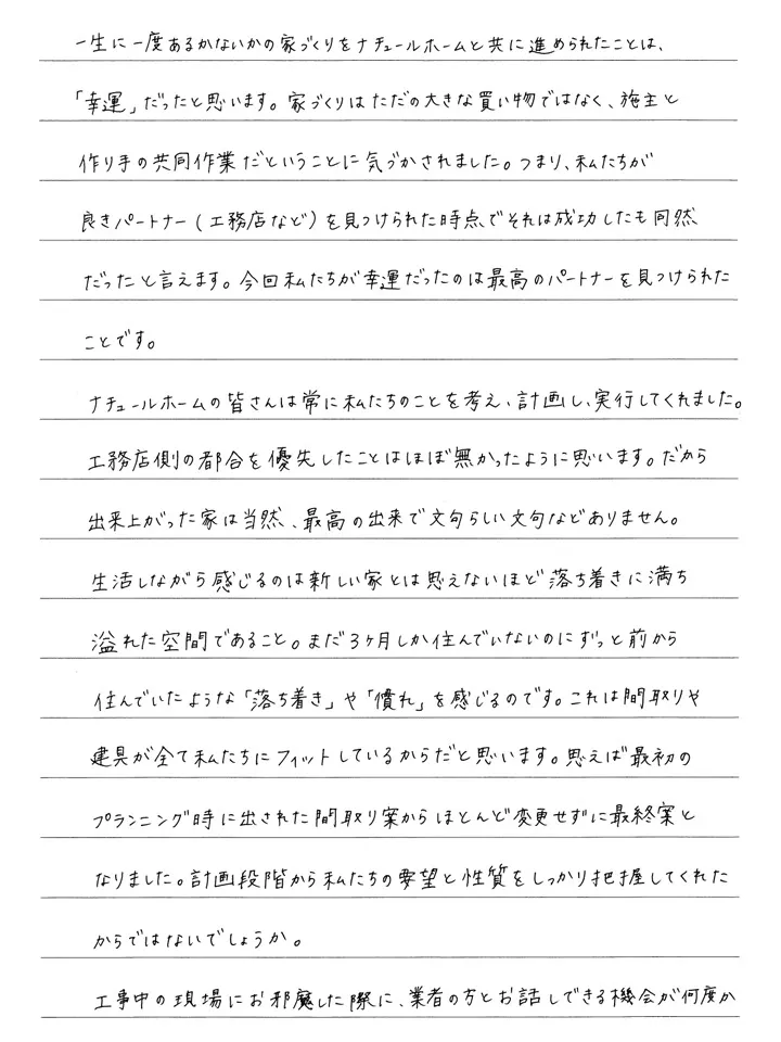 一生に一度あるかないかの家づくりをナチュールホームと共に進められたことは、「幸運」だったと思います。家づくりはただの大きな買い物ではなく、施主と作り手の共同作業だということに気づかされました。