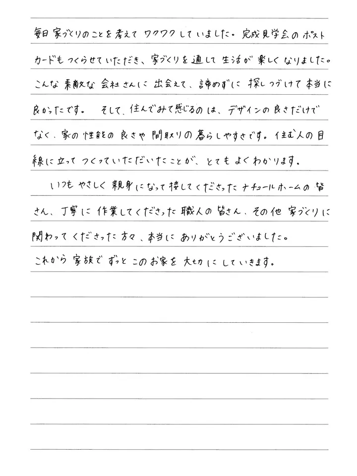 いつもやさしく親身になって接してくださったナチュールホームの皆さん、丁寧に作業してくださった職人の皆さん、その他家づくりに関わってくださった方々、本当にありがとうございました。これから家族でずっとこの家を大切にしていきます。