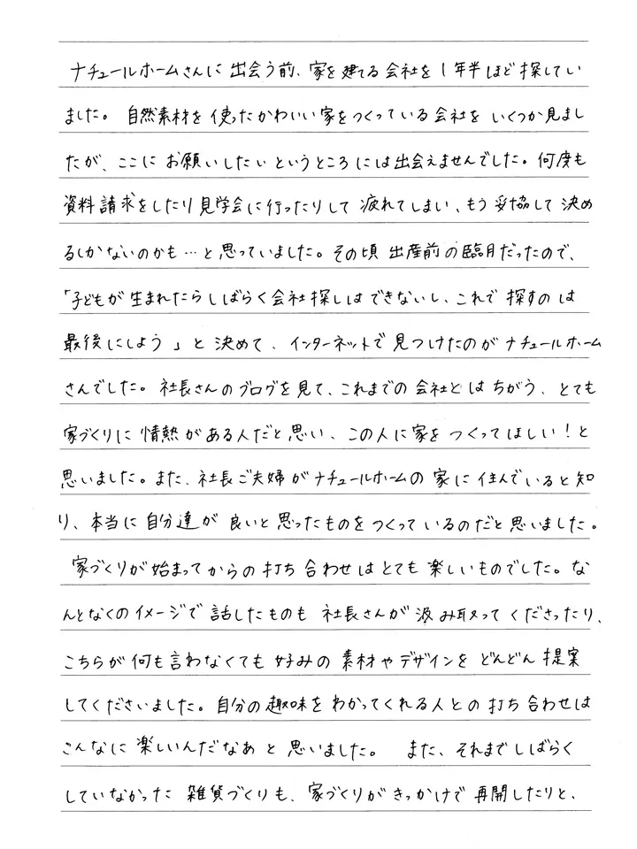 その頃出産前の臨月だったので、「子どもが生まれたらしばらく会社探しはできないし、これで探すのは最後にしよう」と決めて、インターネットで見つけたのがナチュールホームさんでした。社長のブログを見て、これまでの会社とはちがう、とても家づくりに情熱がある人だと思い、この人に家をつくってほしい!と思いました。また、社長ご夫妻がナチュールホームの家に住んでいると知り、本当に自分達が良いと思ったものをつくっているのだと思いました。
