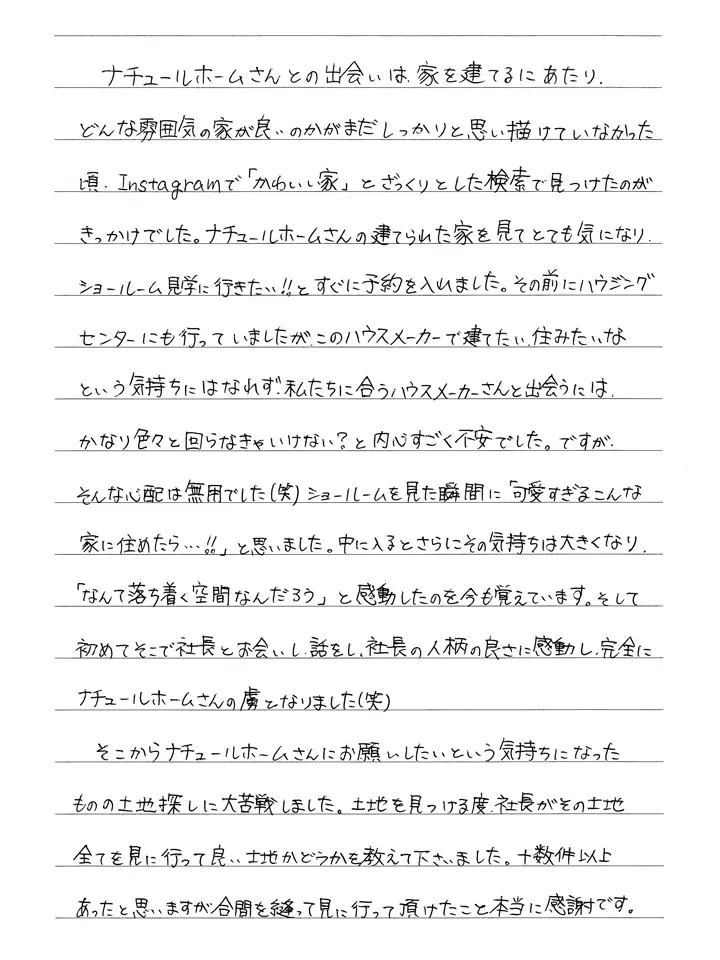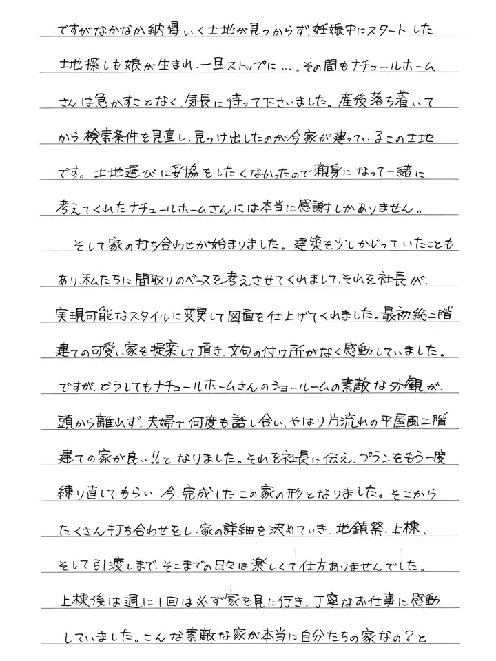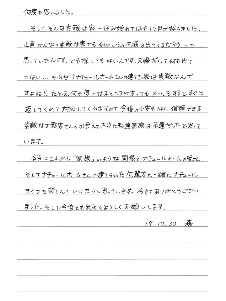 森様、素敵なレターをありがとうございます!「住み始めてからの不満が探しても全く出てこないんです」のくだりのところは何度読み返しても感動します。このように大満足いただける家を建てられたのも、森さんご夫婦がナチュールホームとスタッフのことを心底から信頼してくれていたからだと思います。