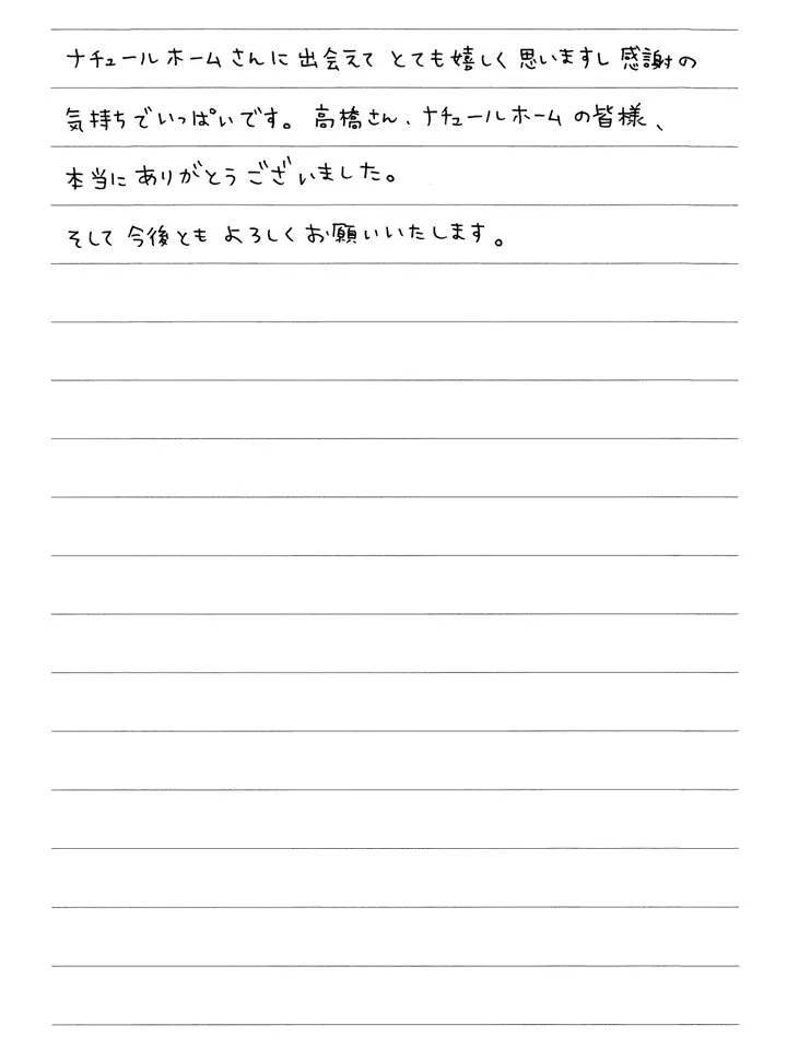 ナチュールホームさんに出会えてとても嬉しく思いますし感謝の気持ちでいっぱいです。高橋さん、ナチュールホームの皆様、本当にありがとうございました。そして今後ともよろしくお願いいたします。