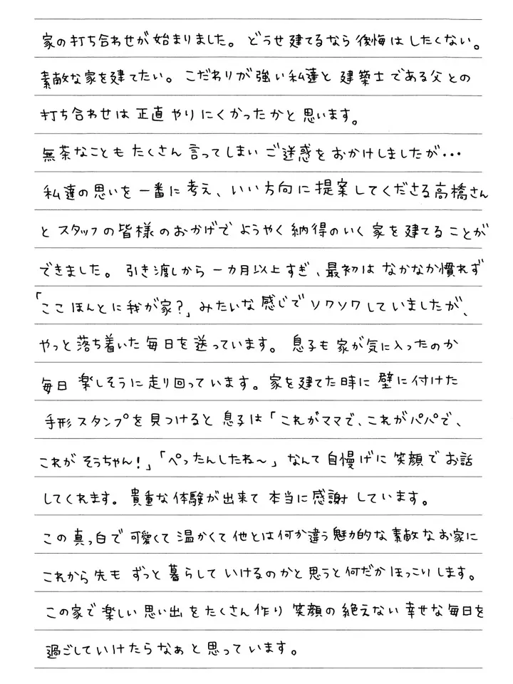 無茶なこともたくさん言ってしまいご迷惑をおかけしましたが…私達の思いを一番に考え、いい方向に提案してくださる高橋さんとスタッフの皆様のおかげでようやく納得のいく家を建てることができました。引き渡しから一ヵ月以上すぎ、最初はなかなか慣れず「ここほんとに我が家?」みたいな感じでソワソワしていましたが、やっと落ち着いた毎日を送っています。息子も家が気に入ったのか毎日楽しそうに走り回っています。家を建てた時に壁に付けた手形スタンプを見つけると息子は「これがママで、これがパパで、これがそうちゃん!」「ぺったんしたね~」なんて自慢げに笑顔でお話してくれます。貴重な体験が出来て本当に感謝しています。