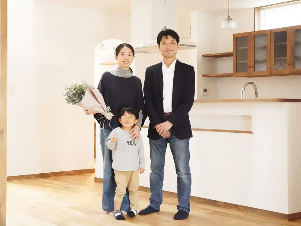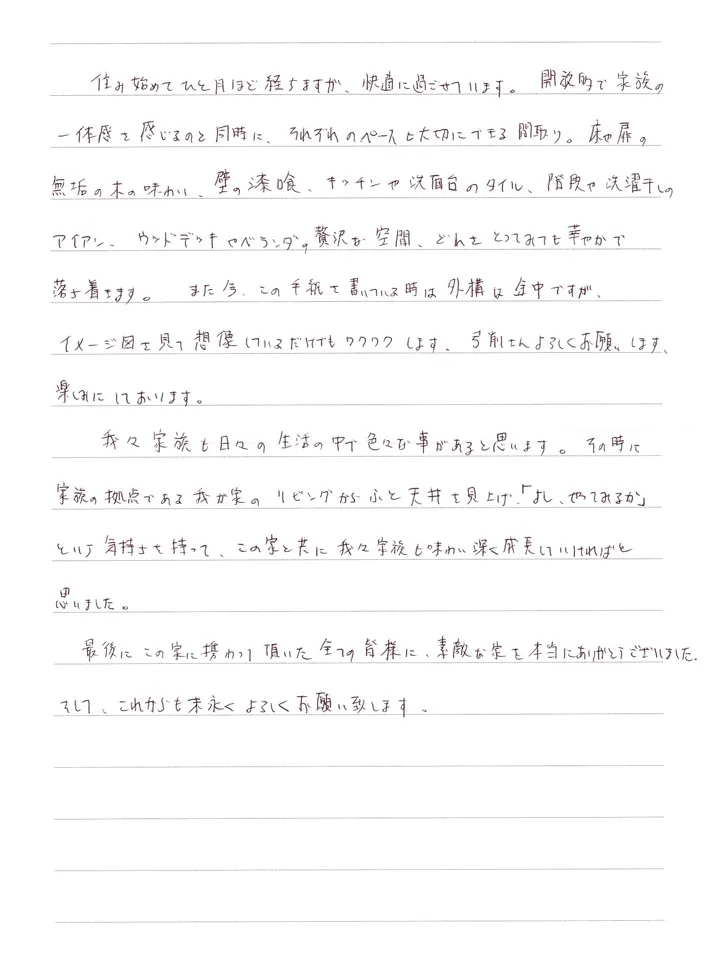 住み始めてひと月ほど経ちますが、快適に過ごせています。開放的で家族の一体感を感じるのと同時に、それぞれのペースを大切にできる間取り。床や扉の無垢の木の味わい。壁の漆喰、キッチンや洗面台のタイル、階段や洗濯干しのアイアン、ウッドデッキやベランダの贅沢な空間、どれをとってみても華やかで落ち着きます。また、今この手紙を書いている時は外構は途中ですが、イメージ図を見て想像しているだけでもワクワクします。弓前さんによろしくお願いします。楽しみにしております。