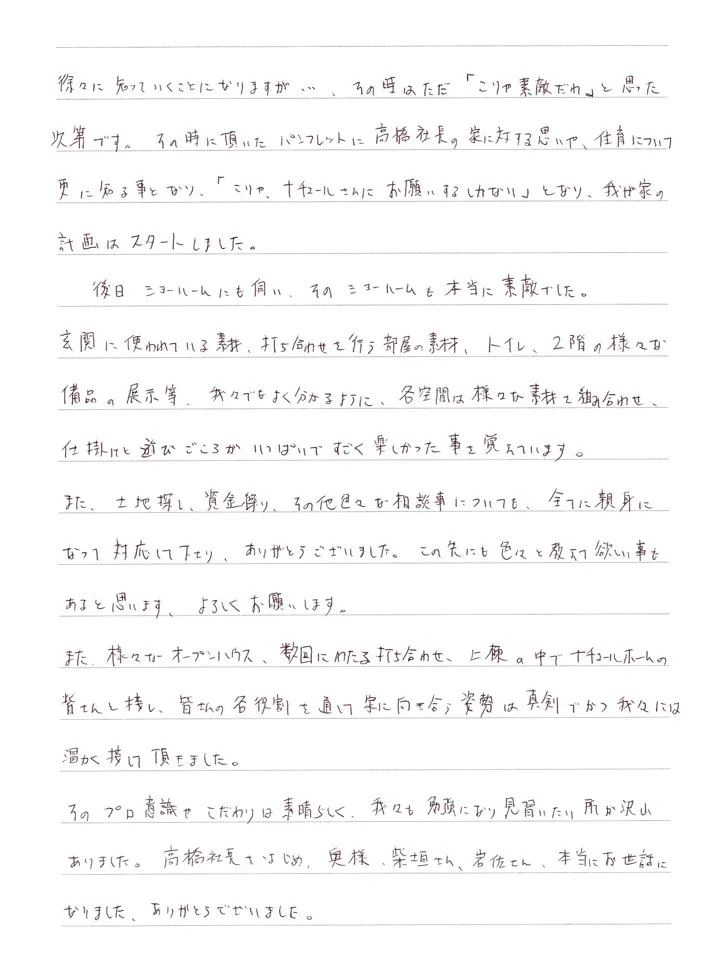 また、様々なオープンハウス、数回にわたる打ち合わせ、上棟の中でナチュールホームの皆さんと接し、皆さんの各役割を通して家に向き合う姿勢は真剣で、かつ我々には温かく接して頂きました。そのプロ意識やこだわりは素晴らしく、我々も勉強になり見習いたい所が沢山ありました。高橋社長はじめ、奥様、柴垣さん、岩佐さん、本当にお世話になりました。ありがとうございました。