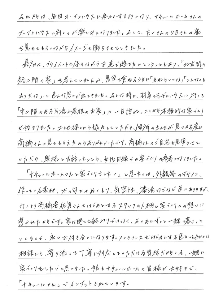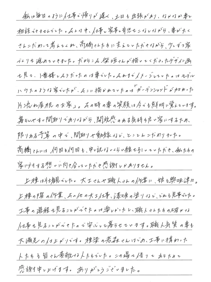 お手紙の最後の、「家を含めた暮らしをデザインしていただいた」 とのお言葉は、弊社のコンセプトそのままの内容で、とても感激しました。家づくりに関わった全ての人に、そしてこれから家づくりを始める方にもぜひ読んでいただきたいお手紙です。