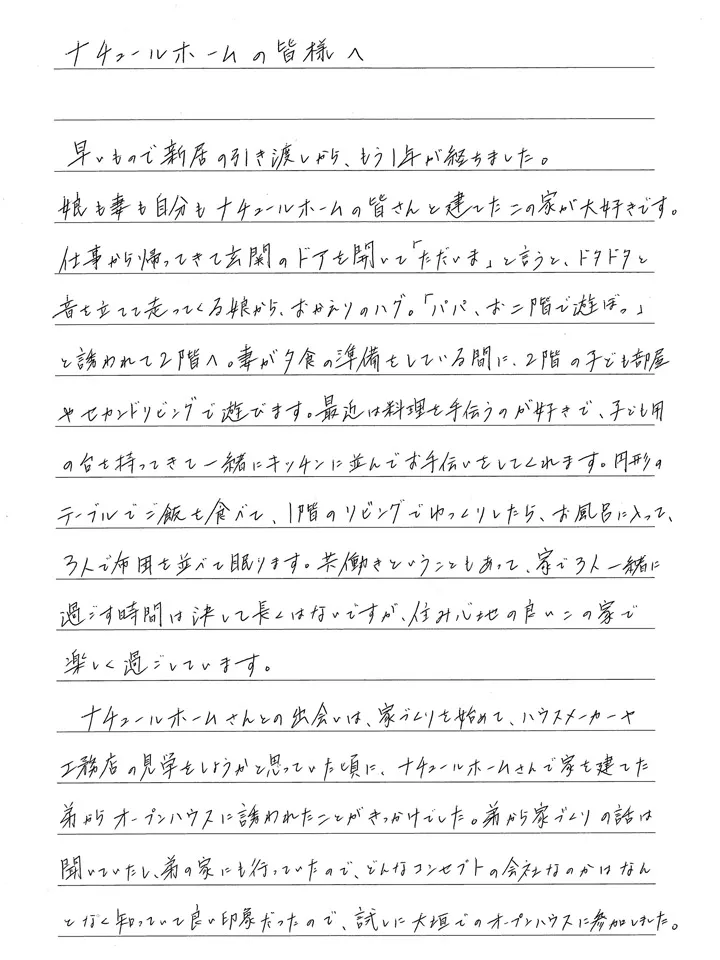 横井様、この度はお手紙をありがとうございます。弊社との出会いからお家の完成、そして暮らし始めて1年が経った現在までの様子が丁寧に綴られており、何度読み返しても感動します。文面から、横井様ご家族が幸せに暮らしていらっしゃる様子が鮮明にイメージできます。