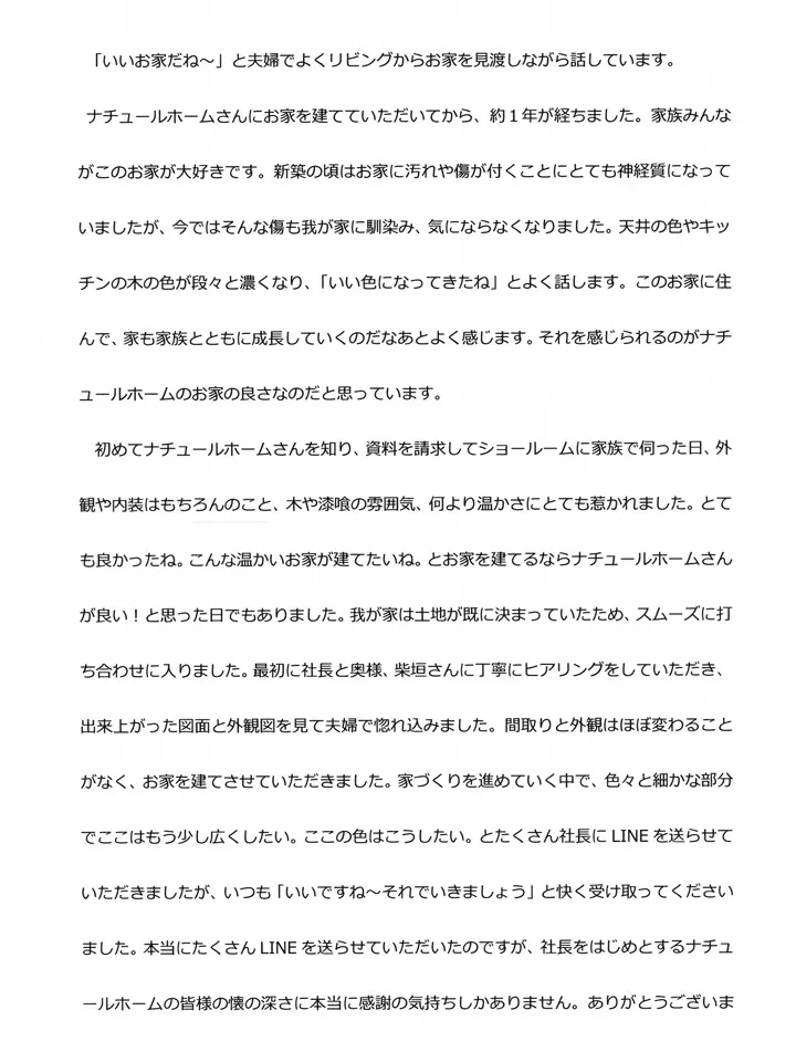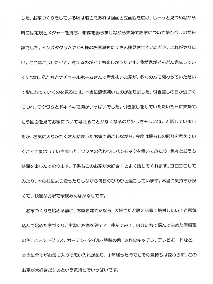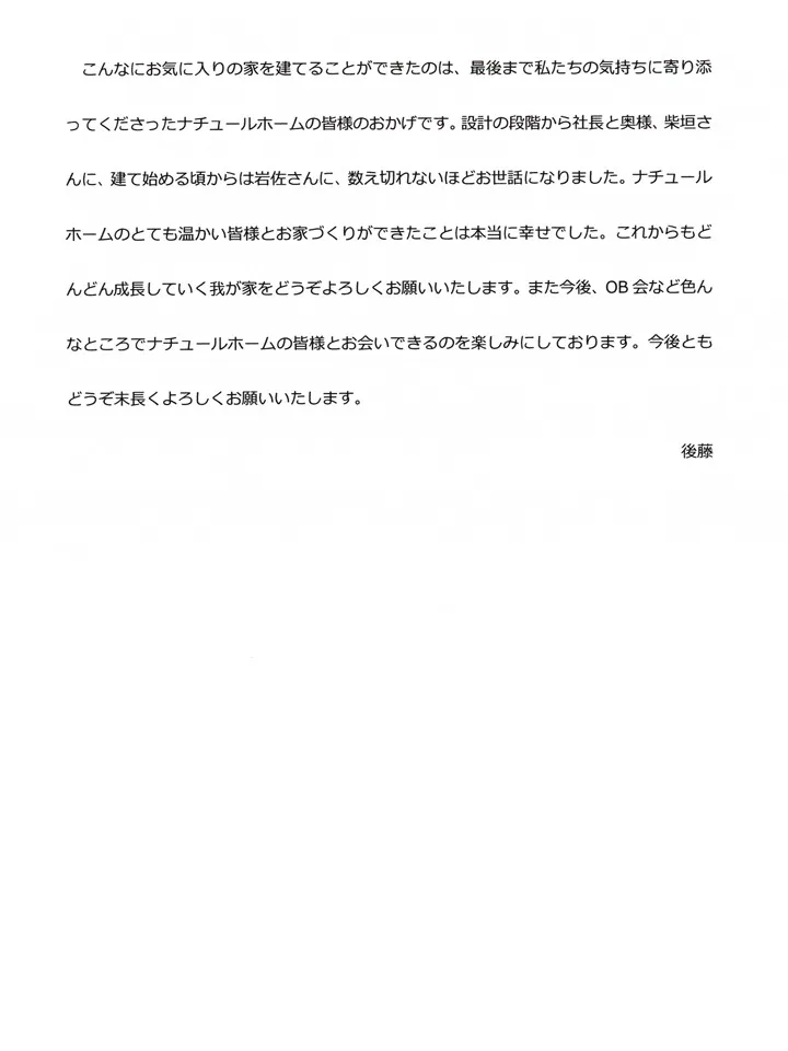 後藤様、この度はお手紙をありがとうございます!お引き渡しから1年が過ぎ、節目にお邪魔したときにお手紙をいただけて、記念になります。後藤様のお気持ちのこもった文面は何度読み返しても感動します。