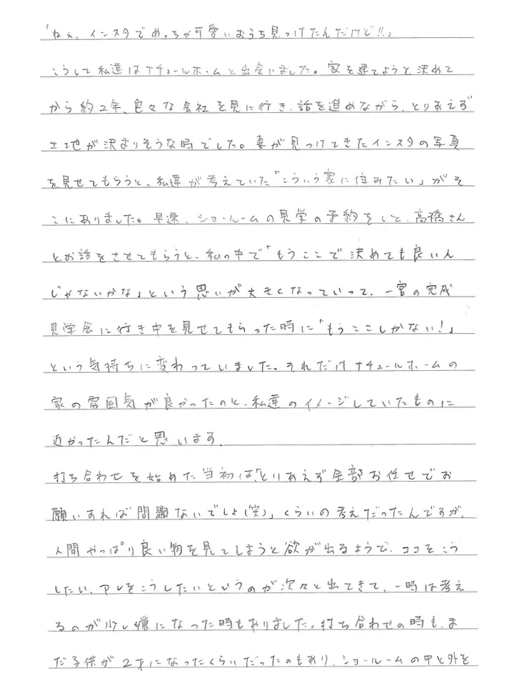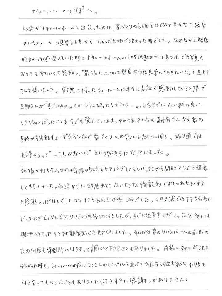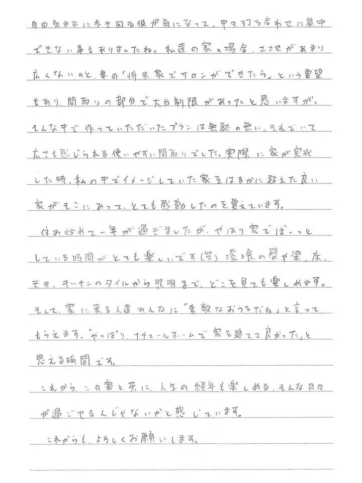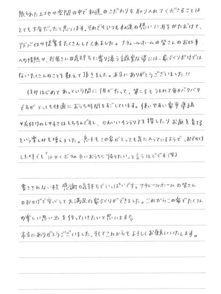 書ききれない程、感謝の気持ちでいっぱいです。ナチュールホームの皆さんのおかげで、安心して大満足の家づくりができました。これからこの家でたくさんの思い出を作っていきたいと思います。本当にありがとうございました。。そして、これからもよろしくお願いいたします。