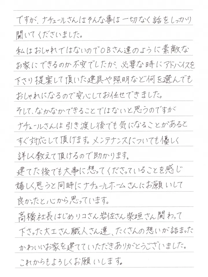 Y様、この度は素敵なお手紙をありがとうございます。一年間暮らしていただいてのご感想が、お引き渡し時よりさらにお家にご満足されているご様子が良く分かり、とても嬉しいです。最初にお会いした時のこと、お打合中のこと、工事中のことが、まるで昨日のことのように蘇ってきました。