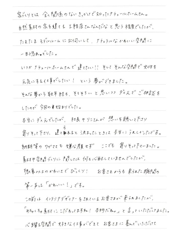 この前はインテリアデザイナーをされているお客さまが来られましたが、「めちゃくちゃ素材にこだわってますね!本物だね。」と言っていただけました。心躍る空間で好きな仕事ができて、お客さまに喜んでいただけてなにより私自身が毎日幸せです。空間(家づくり)を通して女性の夢を叶えてくれるのがナチュールホームさんだと思いました。私の夢を叶えて下さってありがとうございました。
