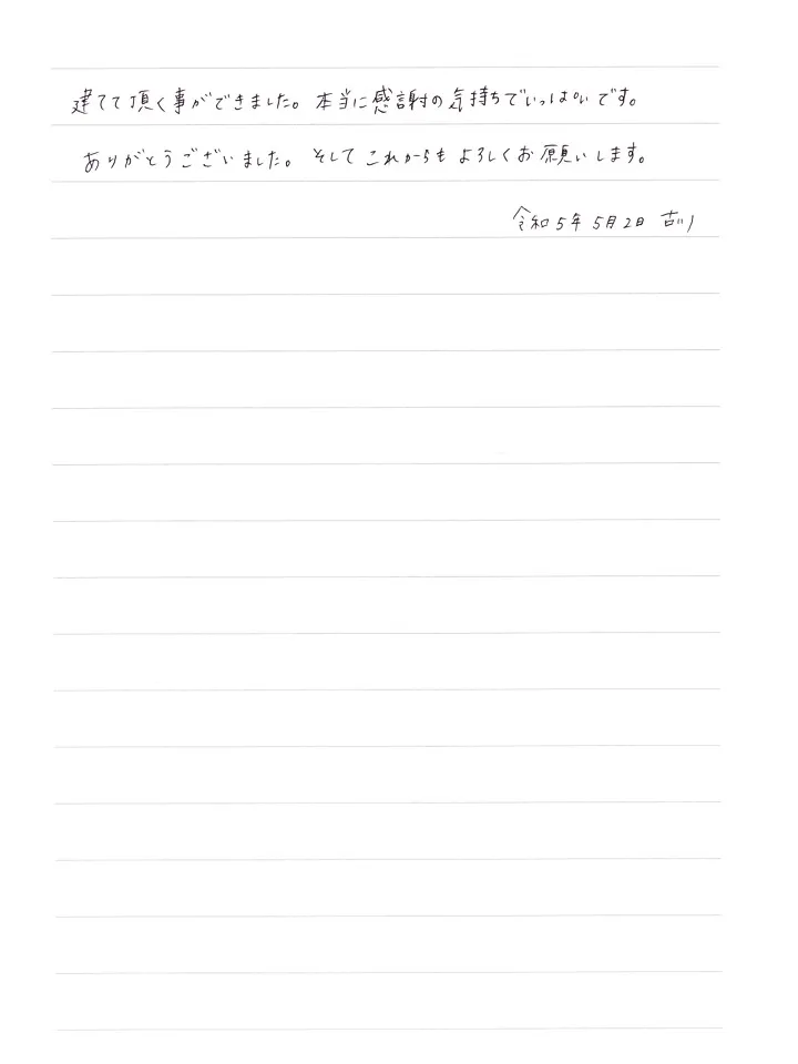 実家の近所に良い土地が見つかり、打ち合わせが始まりました。暮らしのヒヤリングから間取りを作っていただき、私達のイメージしていた間取りにとても近いものが完成してとても嬉しかったです。