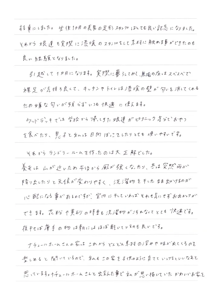 引越して1ヵ月になります。実際に暮らしてみて、無垢の床はスベスベで裸足が気持ち良くて、キッチンやトイレは漆喰の壁が匂いを消してくれるため嫌な匂いが残らずいつも快適に使えます。ウッドデッキでは学校から帰ってきた娘達がピクニック気分でおやつを食べたり、息子と私は日向ぼっこをしたりとても使いやすいです。
