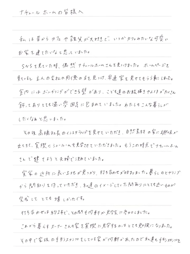 その後高橋社長のインスタライブを見せていただき、自然素材の家に興味が出てきて、実際にショールームも見学させていただきました。もうこの時点でナチュールホームさんで建てようと夫婦で決めていました。