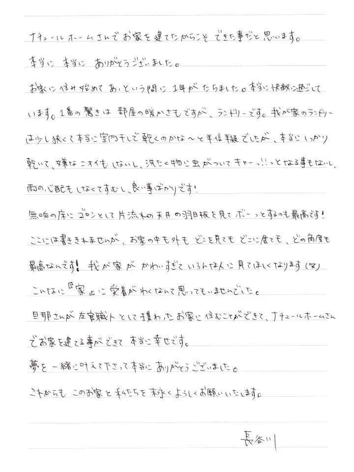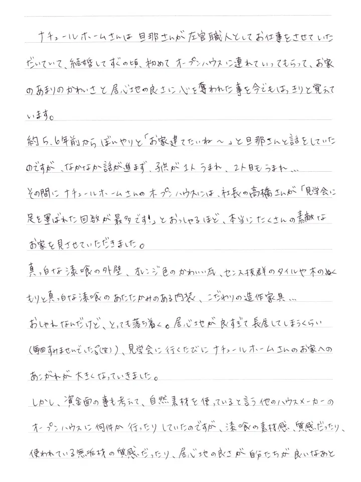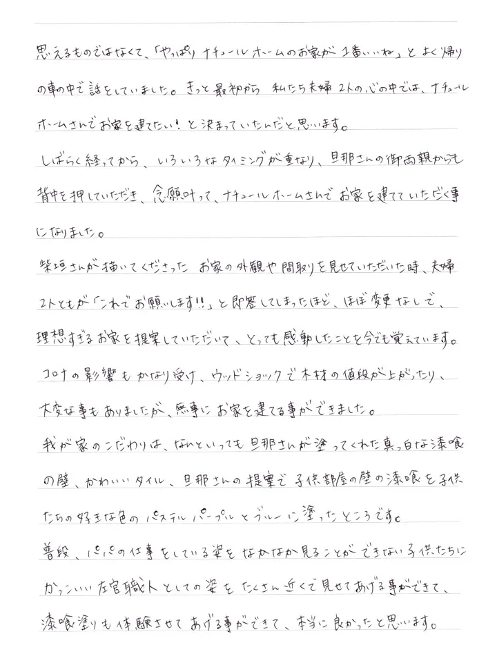 旦那さんが左官職人として携わったお家に住むことができて、ナチュールホームさんでお家を建てる事ができて本当に幸せです。夢を一緒に叶えて下さって本当にありがとうございました。これからもこのお家と私たちを末永くよろしくお願いいたします。