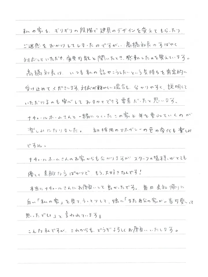 高橋社長は、いつも私の話やこうしたいという気持ちを肯定的に受け止めてくださいます。対応が難しい場合も、分かりやすく説明していただけるのも安心しておまかせできる要素だったと思います。ナチュールホームさんと一緒につくったこの家と年を重ねていくのが楽しみになりました。初採用のマホガニーの色の変化も楽しみですね。