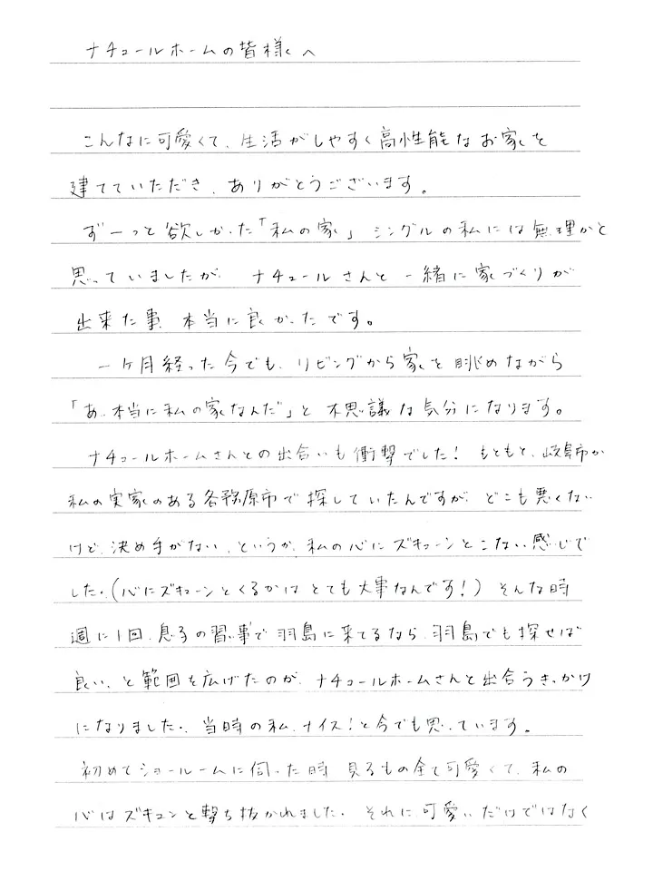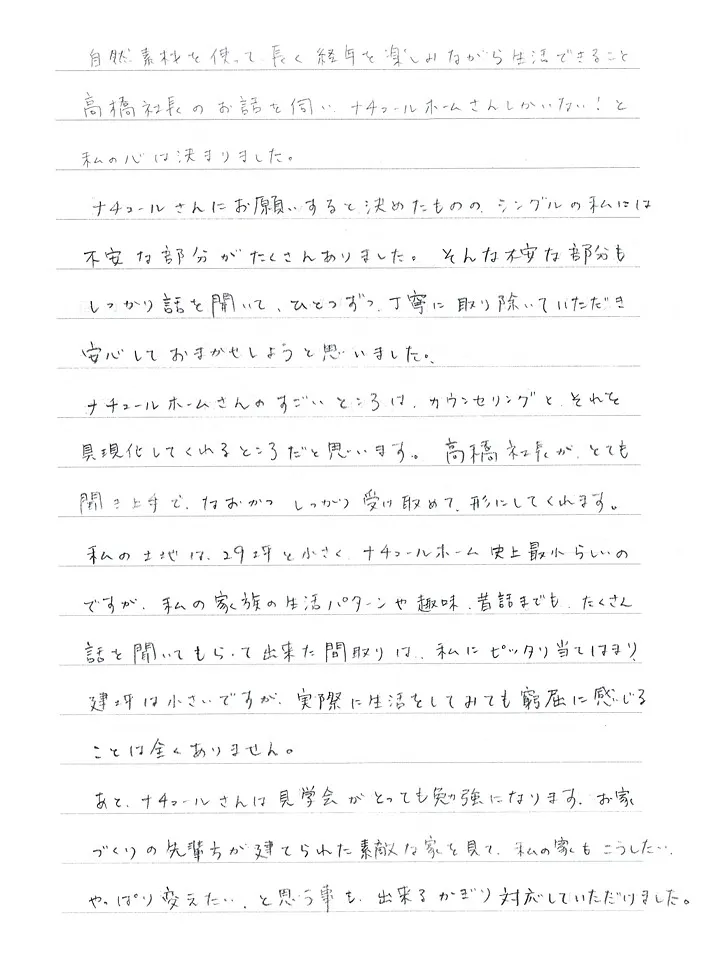 こんなに可愛くて、生活がしやすく高性能なお家を建てていただき、ありがとうございます。ずーっと欲しかった「私の家」、シングルの私には無理かと思っていましたが、ナチュールさんと一緒に家づくりが出来た事、本当に良かったです。一ヶ月経った今でも、リビングから家を眺めながら「あ…本当に私の家なんだ」と不思議な気分になります。