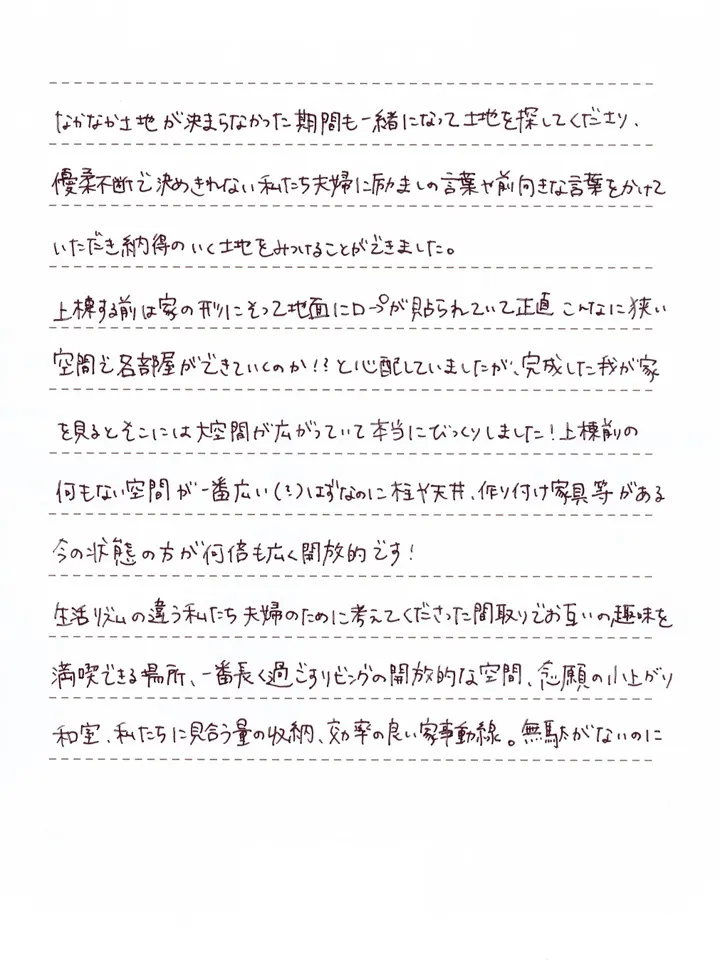 なかなか土地が決まらなかった期間も一緒になって土地を探してくださり、優柔不断で決められない私たち夫婦に励ましの言葉や前向きな言葉をかけていただき、納得のいく土地をみつけることができました。