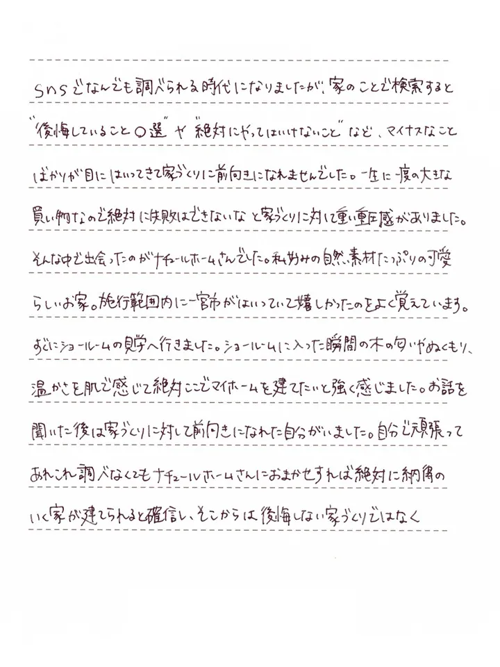 SNSでなんでも調べられる時代になりましたが、家のことで検索すると”後悔していること〇選”や”絶対にやってはいけないこと”など、マイナスなことばかりが目にはいってきて、家づくりに前向きになれませんでした。