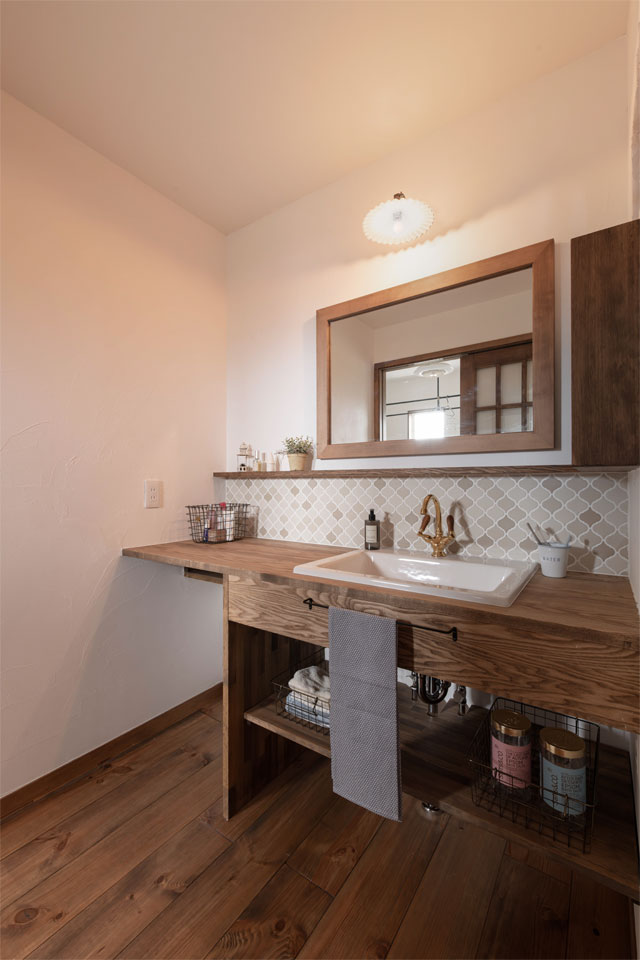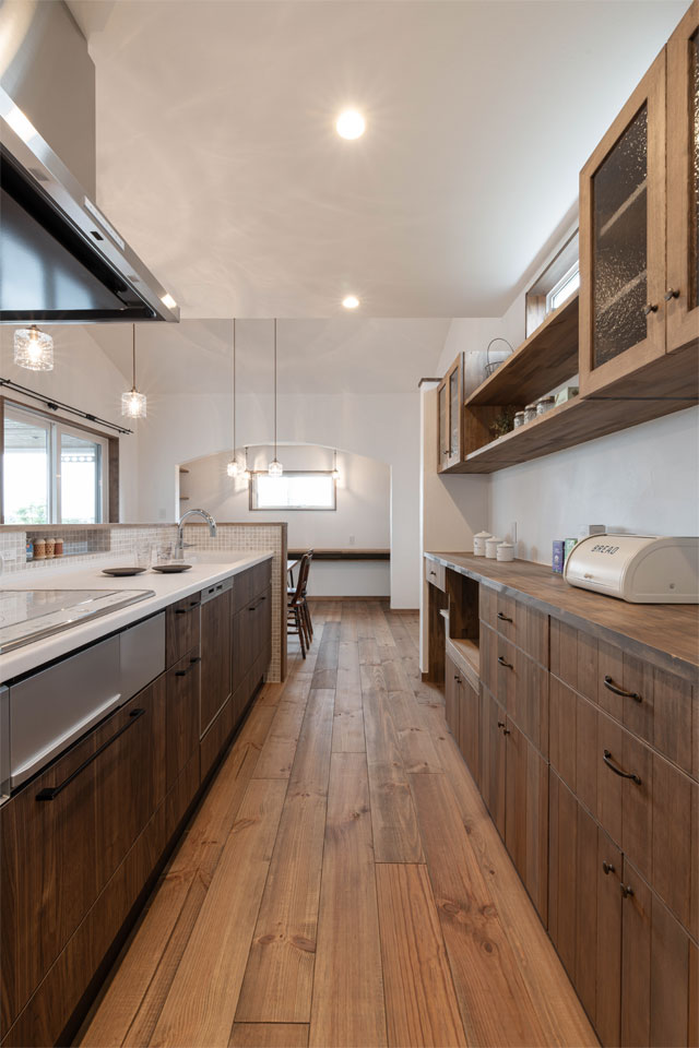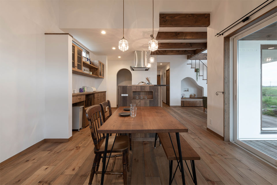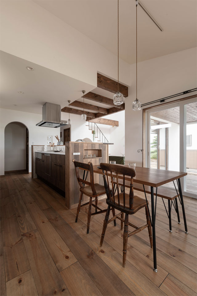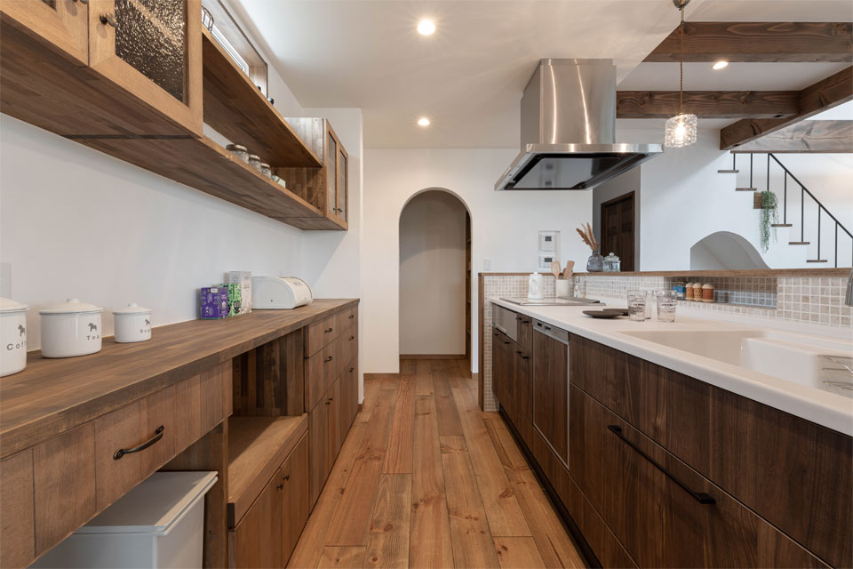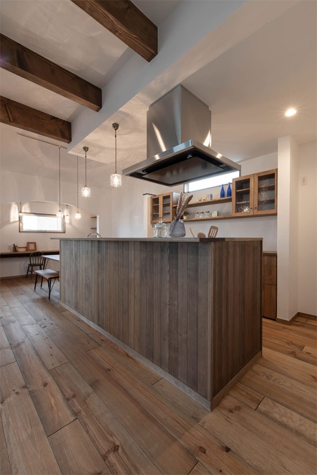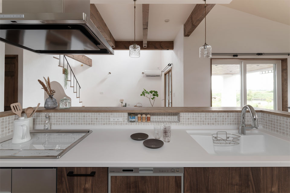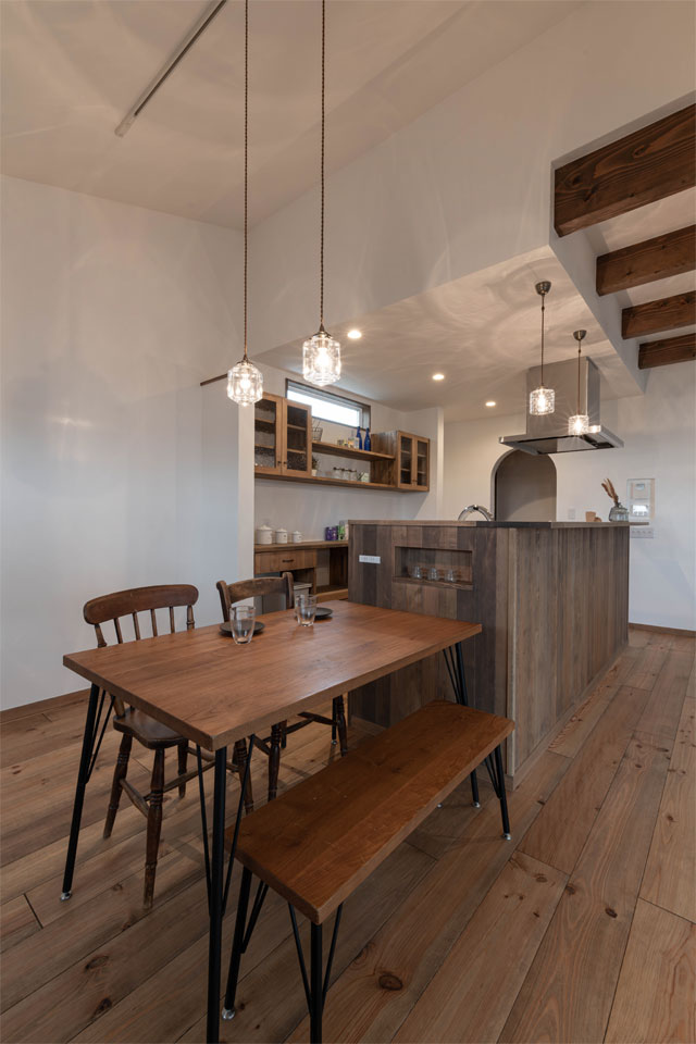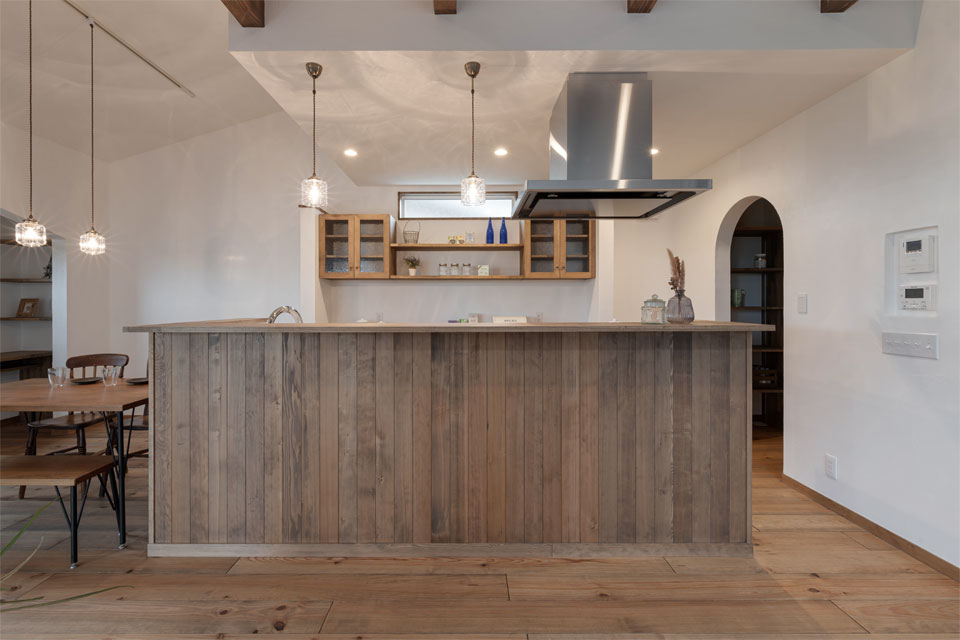LDKの中心にはアイランドキッチンを据え、造作カウンターやカップボードと並ぶ姿がとても愛らしく、奥さまの「大好き」を散りばめたタイルや照明が、家じゅうにやわらかな雰囲気を添えています。