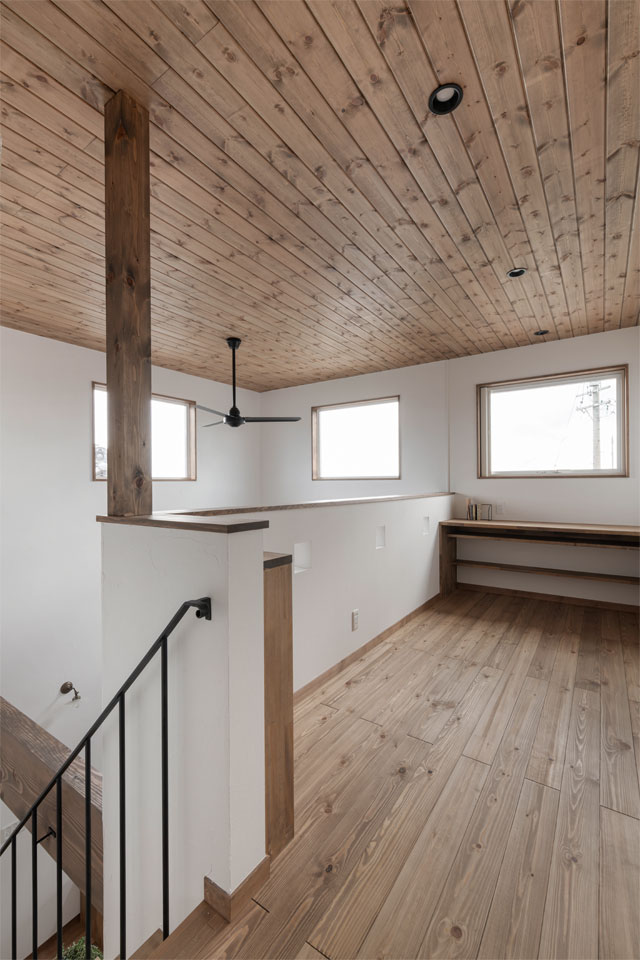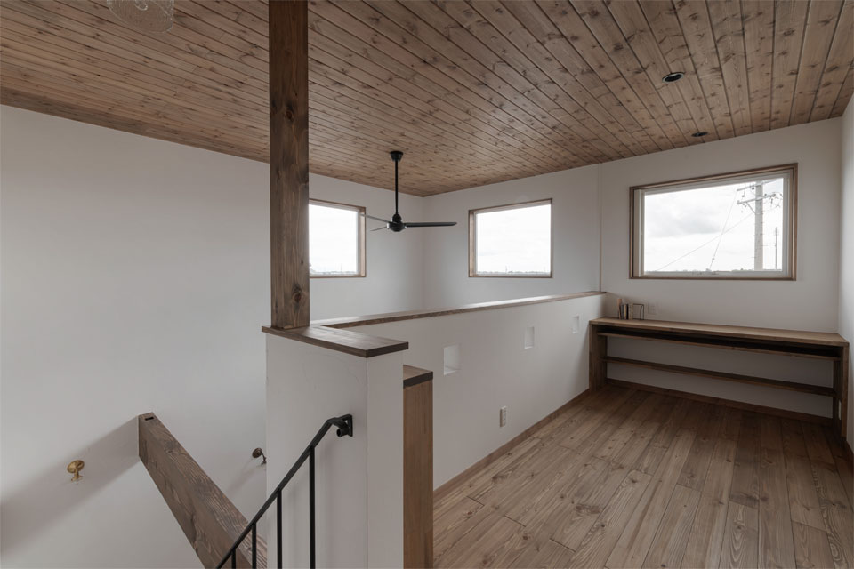 37坪の総二階建ての住まいは、5人家族がのびのびと暮らせるよう、24帖の開放的なLDKと吹抜けを中心に、光と風がやさしく巡る間取りに。リビング上の吹抜けからは空が広がり、2階ホールから眺める景色はまさに特等席です。