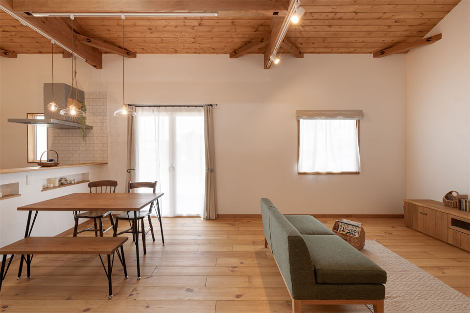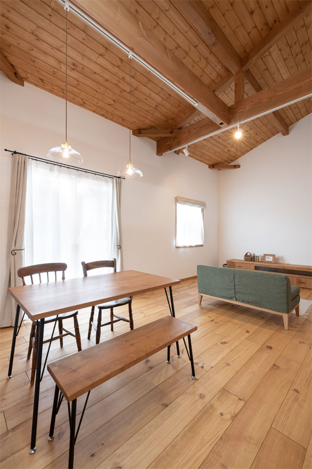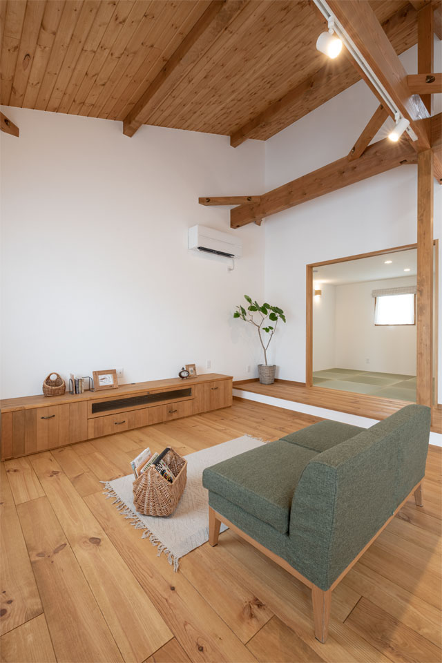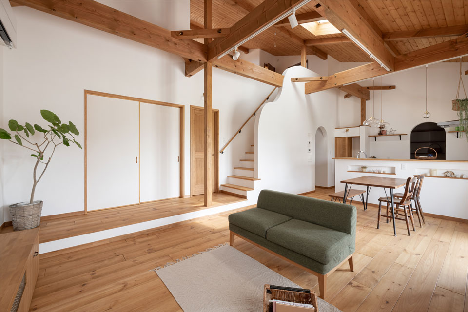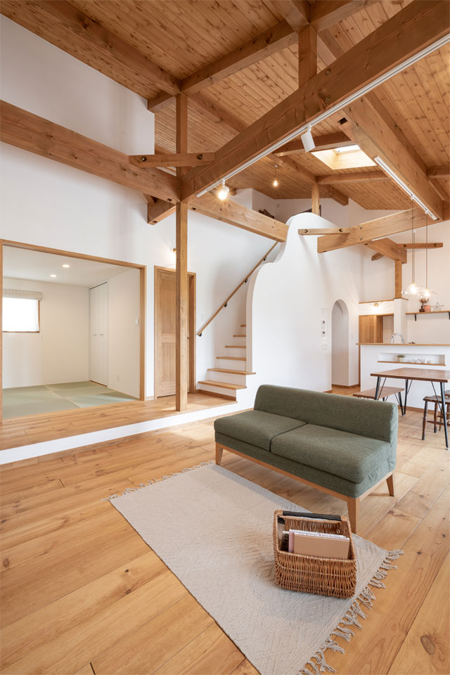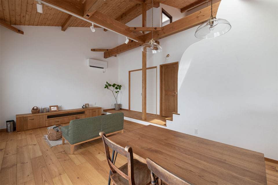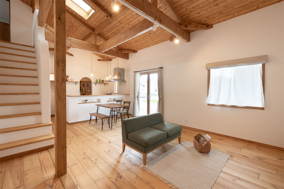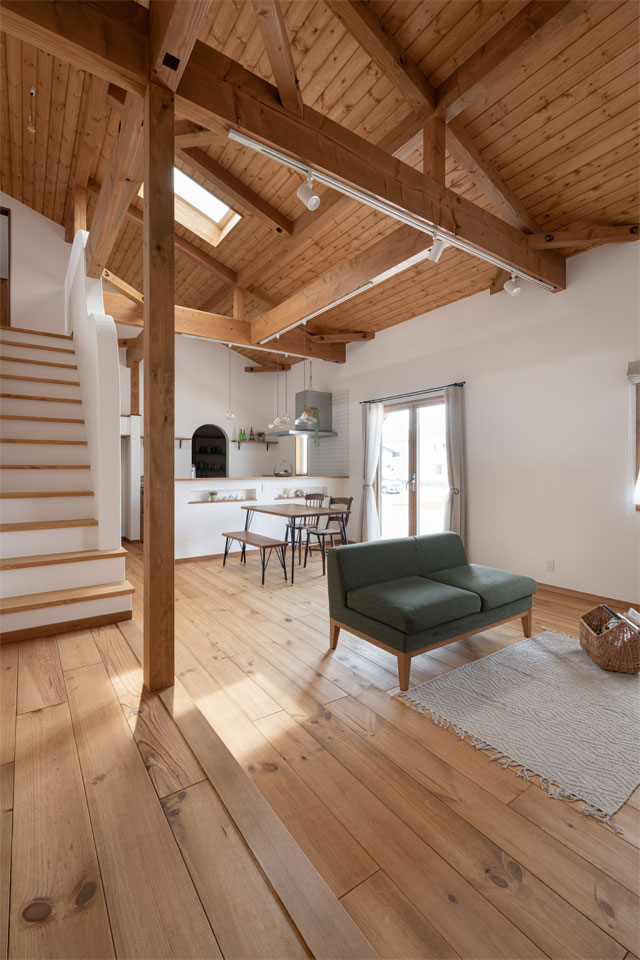 主役となるのは、勾配天井がのびやかに広がる19.5帖のLDK。大きな窓やトップライトからやわらかな光が差し込み、自然素材の心地よさが家中に広がります。日々の暮らしは1階だけで完結できる間取りで、平屋のような過ごしやすさも魅力です。